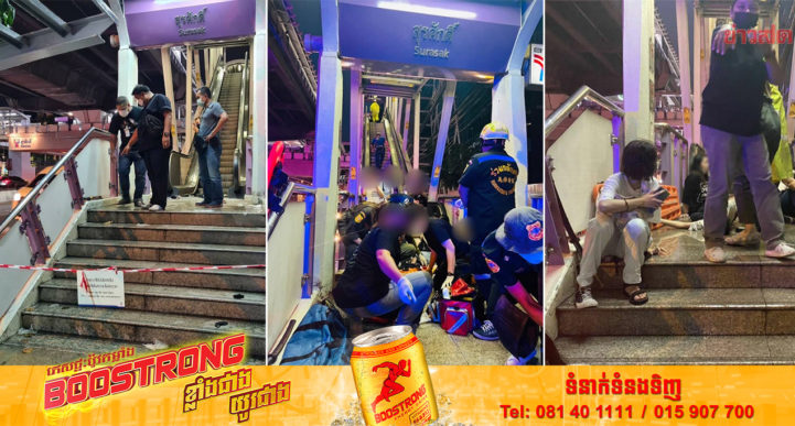 ថៃ៖ កាលពីថ្ងៃទី ២០ សីហា វេលាម៉ោង ១៨:៤៥ នាទី សារព័ត៌មានថៃបានរាយការណ៍ថា ជណ្តើរយន្តនៅ BTS Surasak មានបញ្ហារអាក់រអួល បណ្តាលអោយ រអិលមកក្រោយវិញដោយខ្លួនឯង បណ្តាលអោយមនុស្សជាច្រើននាក់ដែលនៅលើជណ្តើរយន្ត ធ្លាក់ព្រោងព្រៀត ក្នុងនោះដែរមានអ្នករងរបួស ១៥នាក់ ហើយត្រូវបានសមត្ថកិច្ចបញ្ជូនទៅសង្គ្រោះនៅមន្ទីរពេទ្យ ។ គួរបញ្ជាក់អោយដឹងផងដែរថា ខណៈពេលនេះដែរពុំមានសេចក្តីរាយការណ៍ដែលបានបង្ហាញអំពីមូលហេតុ ដែលនាំអោយជណ្តើរយន្តរអាក់រអួលនោះទេ ដោយសារតែជណ្តើរនេះកំពុងតែស្ថិតនៅក្រោមការត្រួតពិនិត្យនៅឡើយ។ ចំពោះហេតុការណ៍ខាងលើនេះដែរបានបណ្តាលអោយប្រជាជននៅម្តុំនោះភ្ញាក់ផ្អើលយ៉ាងខ្លាំង ក៏ដូចជានៅបរិវេណកន្លែងកើតហេតុនោះមានចរាចរណ៍កកស្ទះជាច្រើន ដោយសារតែរថយន្តសង្គ្រោះបន្ទាន់ត្រូវប្រញាប់ប្រញាល់ទៅយកអ្នករបួសជាច្រើននាក់ទៅកាន់មន្ទីរពេទ្យដែលនៅក្បែរនោះ រួមមានមន្ទីរពេទ្យ Charoenkrung មន្ទីរពេទ្យ Taksin និងមន្ទីរពេទ្យ Chulalongkorn ជាដើម៕