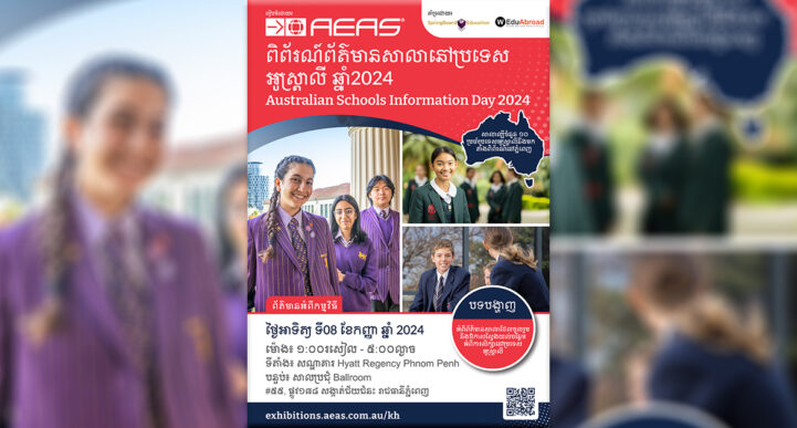 ផ្តល់អានុភាពដល់សិស្សានុសិស្សកម្ពុជាជាមួយមាគ៌ាឆ្ពោះទៅកាន់ការអប់រំលំដាប់ពិភពលោក ថ្ងៃទី ៩ ខែ សីហា ឆ្នាំ ២០២៤ រាជធានីភ្នំពេញ ប្រទេសកម្ពុជា – ពិព័ណ៌ព័ត៌មានសាលារៀនអូស្ត្រាលី AEAS គ្រោងនឹងត្រលប់មកកាន់ទីក្រុងភ្នំពេញវិញម្តងទៀតនាឆ្នាំ ២០២៤ ខាងមុខនេះដែលនឹងផ្តល់ឱកាសដ៏វិសេសវិសាលទៅដល់សិស្សានុសិស្សកម្ពុជា និងអាណាព្យាបាលរបស់ពួកគេក្នុងការស្វែងយល់អំពីឪកាសស្វែងរកការសិក្សាលំដាប់ថ្នាក់ពិភពលោកនៅសាលាបឋមសិក្សា និងមធ្យមសិក្សានៅប្រទេសអូស្ត្រាលី។ ព្រឹត្តិការណ៍ដ៌វិសេសវិសាលមួយនេះគ្រោងនឹងធ្វើឡើងនាថ្ងៃអាទិត្យ ទី ៨ ខែ កញ្ញា ឆ្នាំ ២០២៤ ចាប់ពីម៉ោង ១ រសៀល ដល់ម៉ោង ៥ ល្ងាច នៅសណ្ឋាគារ Hyatt Regency Phnom