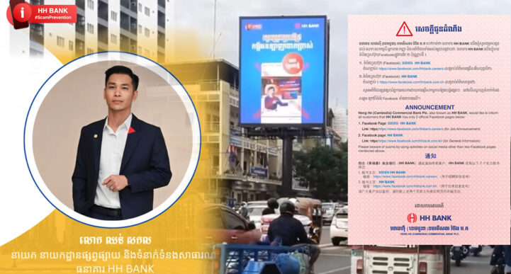 ធនាគារ HH BANK បានកត់សម្គាល់ឃើញថា ថ្មីៗនេះមាន គេហទំព័របន្លំមួយដែលបានប្រើឈ្មោះ HH Bank Cambodia បោកបញ្ឆោត បានបន្លំជាគ្រឹះស្ថានធនាគារ ហេងហ៊ី (ខេមបូឌា) ខមមើសល ប៊ែង ម.ក បានធ្វើការផ្សព្វផ្សាយលើបណ្តាញសង្គម អូសទាញប្រជាពលរដ្ឋឱ្យប្រើ សេវាកម្ចី អនឡាញ តាមរយៈទំព័រហ្វេសប៊ុក ។ លោកនាយក នាយកដ្ឋានផ្សព្វផ្សាយ និងទំនាក់ទំនងសាធារណៈនៃធនាគារ HH BANK បានអោយដឹងថា ជនឆបោកបង្កើតទំព័រហ្វេសប៊ុកក្លែងក្លាយដោយប្រើឈ្មោះ HH Bank Cambodia និងក្លែងបន្លំជាបុគ្គលិកធនាគារ ដោយចម្លងយករូបថតបុគ្គលិក