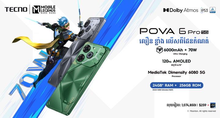 ក្រុមហ៊ុន TECNO Mobile បានប្រកាសចេញនូវ ស្មាតហ្វូនស៊េរីថ្មី TECNO POVA 6 Pro 5G នៅក្នុងទីផ្សារកម្ពុជាហើយ។ស្មាតហ្វូនស៊េរីថ្មីនេះ TECNO POVA 6 Pro 5G ដែលជាស្មាតហ្វូនលេងហ្គេមល្អបំផុត ដែលមានបំពាក់នូវ បន្ទះឈីប 5G ជាមួយថ្មទំហំធំដែលអាច សាកបានលឿនរហូតដល់ 70W តម្លៃក្រោម៣០០ដុល្លារ!។ រូបរាង៖ ការឌីហ្សាញរចនាបថរូបរាងថ្មីប្លែកជាមួយភ្លើង Dynamic Dynamic-light effect នៅក្នុងខាងក្រោយ ជាមួយនឹងគែម Bezel ខ្លី ទម្ងន់ត្រឹមតែ