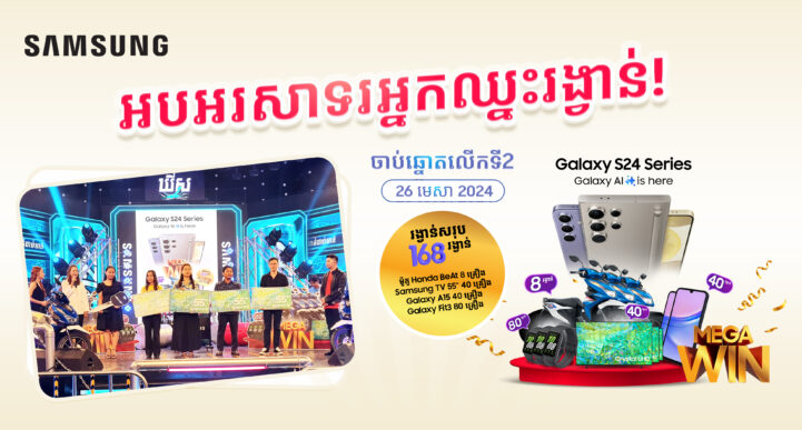 (ភ្នំពេញ) ថ្ងៃទី 30 ខែមេសា ឆ្នាំ 2024៖ អតិថិជនរូបណាខ្លះដែលមិនទាន់បានជាវ កំពូលស្មាតហ្វូន Galaxy S24 Series? ប្រញាប់រួស់រាន់ឡើងណ៎ា! រង្វាន់សរុបរហូតដល់ 168 រង្វាន់ពីកម្មវិធីរង្វាន់ធំអស្ចារ្យ Galaxy S24 MEGA WIN កំពុងរង់ចាំ អតិថិជនជាទីស្រលាញ់ទាំងអស់គ្នា! នេះជាសប្ដាហ៍ទី 2 ហើយនៃកម្មវីធី Galaxy S24 MEGA WIN ពីសាមសុង បានធ្វើការផ្ដល់រង្វាន់ដ៏អស្ចារ្យដល់អតិថិជនទូទាំងប្រទេសដែលបានជាវនូវកំពូលស្មាតហ្វូន Galaxy S24 Series ចាប់ពីថ្ងៃនេះដល់ថ្ងៃទី