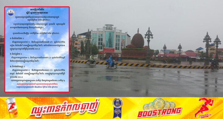 រាជធានីភ្នំពេញ៖ នាព្រឹកថ្ងៃទី១៣ ខែមីនា ឆ្នាំ២០២៤ នេះ ក្រសួងធនធានទឹក និងឧតុនិយម បានជូនដំណឹងអំពីស្ថានភាពធាតុអាកាសនៅព្រះរាជាណាចក្រកម្ពុជា ចាប់ពីថ្ងៃទី១៣ ដល់ថ្ងៃទី១៥ ខែមីនា ឆ្នាំ២០២៤។ នៅក្នុងសេចក្ដីជូនដំណឹង ក្រសួងក្រសួងធនធានទឹក បានបញ្ជាក់ថា សម្ពាធទាបបានគ្របដណ្ដប់មកលើព្រះរាជាណាចក្រកម្ពុជា ប្រទេសថៃ ឈូងសមុទ្រថៃ ភាគកណ្តាលនៃអាងទន្លេមេគង្គ និងសមុទ្រចិនខាងត្បូង។ ស្ថានភាពបែបនេះនឹងធ្វើឱ្យ៖ ចាប់ពីថ្ងៃទី១៣ ដល់ថ្ងៃទី១៥ ខែមីនា ឆ្នាំ២០២៤៖ ១. តំបន់វាលទំនាប ៖ ⁃ សីតុណ្ហភាពអប្បបរមា២៥°C និងសីតុណ្ហភាពអតិបរមា៣៧°C ។ ខ្យល់បក់មកពីទិសទក្សិណ និងទិសនិរតី