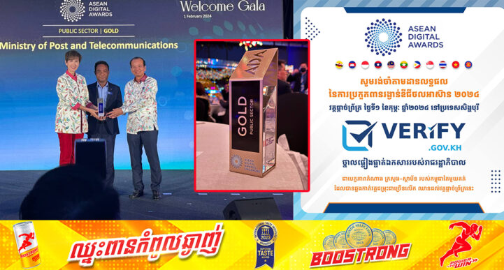 ថ្នាលផ្ទៀងផ្ទាត់ឯកសារ verify.gov.kh របស់កម្ពុជា បានឈ្នះមេដាយមាសនៃពានរង្វាន់ឌីជីថលអាស៊ានឆ្នាំ២០២៤ (ASEAN Digital Awards 2024) ដែលរៀបចំនៅ ប្រទេសសិង្ហបុរី។ នេះបើយោងតាមសេចក្ដីប្រកាសព័ត៌មានរបស់ក្រសួងប្រៃសណីយ៍ និងទូរគមនាគមន៍ នៅថ្ងៃទី០១ ខែកុម្ភៈ ឆ្នាំ២០២៤ នេះ។ តាមសេចក្ដីប្រកាសព័ត៌មាន បានបញ្ជាក់ថា ក្រសួងប្រៃសណីយ៍និងទូរគមនាគមន៍ (ក.ប.ទ.) មានកិត្តិយសសូមជម្រាបជូនសាធារណជនទាំងអស់ មេត្តាជ្រាបថា នៅថ្ងៃទី១ ខែកុម្ភៈ ឆ្នាំ២០២៤ “ថ្នាលផ្ទៀងផ្ទាត់ឯកសាររបស់រាជរដ្ឋាភិបាល verify.gov.kh” ដែលអភិវឌ្ឍដោយ ក.ប.ទ. បានឈ្នះមេដាយមាស នៃពានរង្វាន់ឌីជីថលអាស៊ានឆ្នាំ២០២៤ ដែលរៀបចំនៅប្រទេសសិង្ហបុរី ក្រោមក្របខណ្ឌកិច្ចប្រជុំរដ្ឋមន្ត្រីឌីជីថលអាស៊ាន លើកទី៤