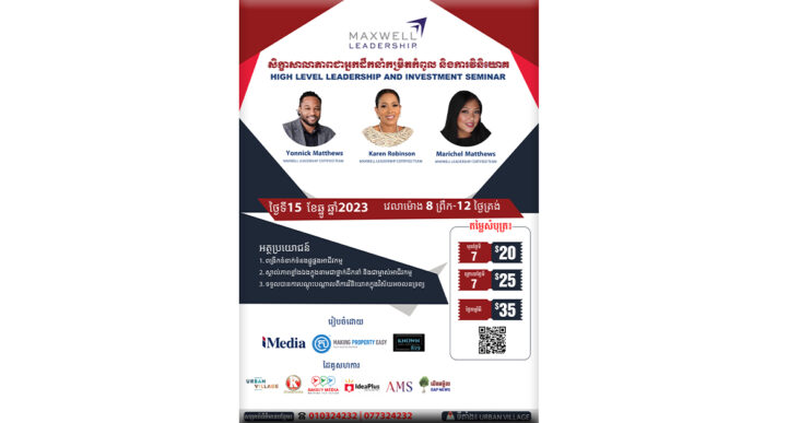 ភ្នំពេញ៖ នៅថ្ងៃទី១៥ ខែធ្នូ ឆ្នាំ២០២៣ ខាងមុខនេះ MAXWELL LEADERSHIP ដែលជាកំពូលថ្នាក់ដឹកនាំបង្វឹកភាពជាអ្នកដឹកនាំលំដាប់ពិភពលោក ដែលមកពីសហរដ្ឋអាមេរិច នឹងធ្វើការរៀបចំសិក្ខាសាលាស្តីពី «ភាពជាអ្នកដឹកនាំកម្រិតកំពូល និងការវិនិយោគ» ដោយមានការចូលរួមពីសំណាក់វាគ្មិនដែលសុទ្ធសឹងតែមានបទពិសោធន៍ជាច្រើនឆ្នាំ ក្នុងការបង្វឹកភាពជាអ្នកដឹកនាំទៅកាន់ ថ្នាក់ដឹកនាំ និងម្ចាស់អាជីវកម្មជុំវិញពិភពលោក ក៏ដូចជាការវិនិយោគពាន់លាន ក្នុងនោះវាគ្មិនរួមមាន៖ លោកស្រី Karen Robinson លោក Yonnick Matthews និងលោកស្រី Marichel Matthews។ គោលបំណងសំខាន់នៃសិក្ខាសាលានេះ គឺដើម្បីបង្កើតបណ្ដាញទំនាក់ទំនង និងផ្គូរផ្គងអាជីវកម្ម ការផ្លាស់ប្តូរ និងចែករំលែកបទពិសោធន៍រវាងម្ចាស់អាជីវកម្ម និងម្ចាស់អាជីវកម្មផ្សេងៗគ្រប់វិស័យ