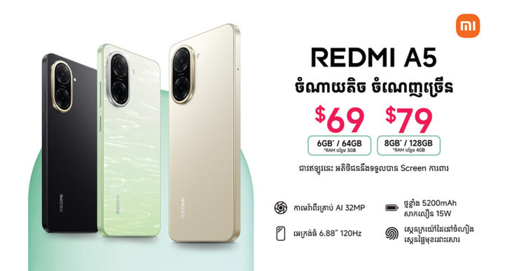 ទីក្រុងភ្នំពេញ ប្រទេសកម្ពុជា ថ្ងៃទី 5 ខែមេសា ឆ្នាំ 2025 – Xiaomi Corporation (“Xiaomi” ឬ “Group”; stock code: 1810) ដែលជាក្រុមហ៊ុនផលិតគ្រឿងអេឡិចត្រូនិក និងឧបករណ៍ឆ្លាតវៃដែលមានស្មាតហ្វូន និង hardware ដែលភ្ជាប់ដោយប្រព័ន្ធ Internet of Things (“IoT”) បានប្រកាសលក់នូវស្មាតហ្វូនស៊េរីថ្មី Redmi A5 ដែលបានដំឡើងនូវមុខងារពិសេសៗជាច្រើន ដែលអាចដំណើរការបានយ៉ាងរលូនសម្រាប់អតិថិជនរបស់ខ្លួន។ ជាមួយនឹងការរចនាដ៏ស្រស់ស្អាត កាមេរ៉ាដ៏ច្បាស់គួរឱ្យកត់សម្គាល់ និងអេក្រង់ធំជាងមុន។ Redmi