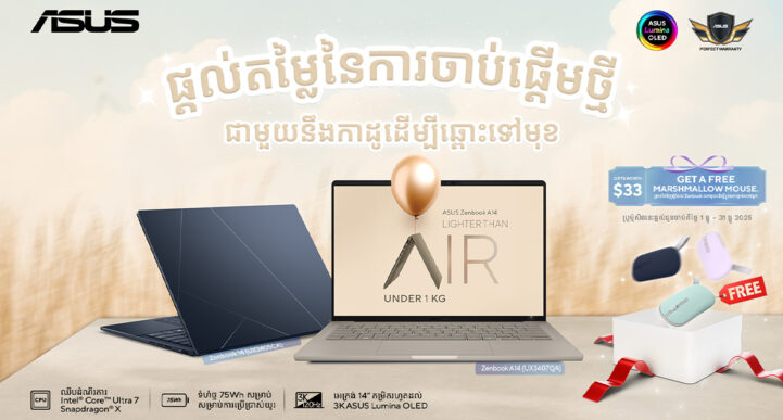 ភ្នំពេញ, ថ្ងៃទី 7 ខែធ្នូ ឆ្នាំ 2025 — ក្រុមហ៊ុន ASUS មានមោទកភាពក្នុងការប្រកាសពីភាពជោគជ័យឥតឈប់ឈរនៃស៊េរី ASUS Zenbook ដែលត្រូវបានទទួលស្គាល់ដោយអ្នកប្រើប្រាស់កម្ពុជាថាជាជម្រើស Thin & light laptop ល្អបំផុតប្រចាំឆ្នាំ 2025 ។ ជាមួយនឹងភាពងាយស្រួលក្នុងការចល័តកម្រិត Premium, អេក្រង់ Laptop OLED ដ៏អស្ចារ្យ, និងសមត្ថភាព AI PC ជំនាន់ថ្មី ASUS Zenbook បានក្លាយជាដៃគូដែលគួរឱ្យទុកចិត្តសម្រាប់សិស្ស-និស្សិត, អ្នកជំនាញ,