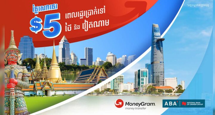 ចង់ផ្ញើប្រាក់ទៅកាន់កូន ឬសាច់ញាតិរបស់អ្នក ដែលកំពុងសិក្សា ធ្វើការ ឬរស់នៅក្នុងប្រទេសថៃ និងវៀតណាម ឬផ្ញើប្រាក់ដើម្បីដំណើរការអាជីវកម្ម ឬ ទៅកាន់ដៃគូអាជីវកម្មរបស់អ្នក? ជាមួយ ABA MoneyGram អ្នកអាចផ្ញើប្រាក់ជាមួយតម្លៃថេរត្រឹមតែ ៥ដុល្លារ ប៉ុណ្ណោះ។ រយៈពេលប្រូម៉ូសិនមានចាប់ពីថ្ងៃនេះ រហូតដល់ថ្ងៃទី៣១ ខែធ្នូ ឆ្នាំ២០២២ ទេណា! ដំណើរការនៃប្រូម៉ូសិន៖ អ្នកអាចផ្ទេរប្រាក់ពី ABA Mobile និង/ឬបញ្ជរធនាគារ ABA ទៅគណនីធនាគារ និង/ឬភ្នាក់ងារ MoneyGram នៅប្រទេសថៃ និងវៀតណាម ជាមួយថ្លៃសេវាផ្ទេរថេរ ៥ដុល្លារ សម្រាប់ការផ្ទេរក្នុងចំនួនណាមួយ