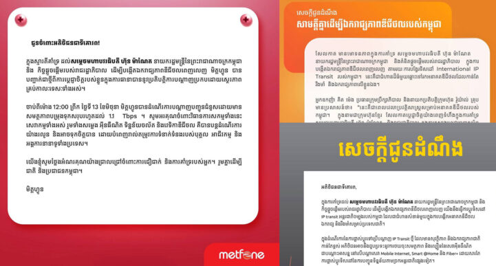 វិស័យទូរគមនាគមន៍របស់កម្ពុជា កំពុងជួបប្រទះភាពរអាក់រអួលជាខ្លាំង ដោយមានការថយចុះនូវសមត្ថភាព និងល្បឿនសេវាអ៊ីនធឺណិតជាលក្ខណៈទ្រង់ទ្រាយធំ ចាប់តាំងពីពាក់កណ្តាលយប់ថ្ងៃទី 12 ខែមិថុនា។ ភាពរអាក់រអួលក្នុងការផ្តត់ផ្គង់អ៊ីនធឺណិតនេះ បានប៉ះពាល់ដល់ការប្រើប្រាស់ប្រចាំថ្ងៃរបស់បុគ្គល ក៏ដូចជាទំនាក់ទំនងអាជីវកម្មលក់ដូរផ្សេងៗ ក៏ដូចជាប៉ះពាល់ដល់ជីវិតប្រចាំថ្ងៃ និងប្រតិបត្តិការពាណិជ្ជកម្មទូទាំងប្រទេស។ យើងក៏ឃើញមានការភ្ញាក់ផ្អើល និងបានឃើញការប្រកាសបង្ហោះនៅលើ Facebook និងបណ្តាញប្រព័ន្ធផ្សព្វផ្សាយសង្គមផ្សេងៗទៀត ដែលបានបង្ហាញថា សេវាអ៊ីនធឺណិត ការតេទូរសព្ទទាក់ទងគ្នា និងការប្រើប្រាស់អ៊ីនធឺណិតនៅលើទូរសព្ទដៃ (ទិន្នន័យចល័ត) មួយចំនួនធំ បានធ្លាក់ចុះទាំងស្រុង ឬរហូតដល់ស្ទើរតែគ្មានសញ្ញាណសេវាប្រើប្រាស់ទៀត នៅព្រឹកថ្ងៃសុក្រនេះ។ ក្រុមហ៊ុន Smart, Cellcard និង Metfone ក៏បានបង្ហាញពីការប្តេជ្ញាចិត្តរបស់ពួកគេនៅផេកហ្វេកប៊ុកផ្លូវការរបស់ពួកគេផងដែរ ក្នុងការស្តារភ្ជាប់ដំណើរការ និងមានស្ថេរភាពឡើងវិញឱ្យបានលឿន តាមដែលអាចធ្វើទៅបានក្នុងពេលឆាប់ៗ។