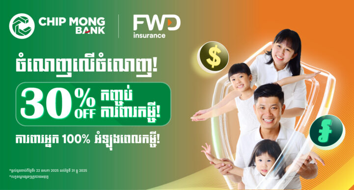 អតិថិជនធនាគារ ជីប ម៉ុង នឹងទទួលបានការបញ្ចុះតម្លៃ30% លើកញ្ចប់ការពារកម្ចីរបស់ក្រុមហ៊ុនធានារ៉ាប់រងអាយុជីវិតFWD Cambodia។ ការផ្ដល់ជូនពិសេសនេះ មិនមែនធ្វើឡើងដើម្បីទាញប្រាក់ចំណេញចូលទៅធនាគារនោះទេ តែជាការបញ្ជាក់យ៉ាងច្បាស់ថាធនាគារ ជីប ម៉ុង មិនត្រឹមតែជាធនាគារដែលផ្តល់ទំនុកចិត្តខ្ពស់ដល់អតិថិជននោះទេ តែក៏ជាធនាគារដែលតែងតែគិតគូរ យ៉ាងហ្មត់ចត់ និងការពារដល់អតិថិជនរបស់ធនាគារ ជីប ម៉ុង គ្រប់វិនាទី និងគ្រប់ពេលវេលា។ ធនាគារ ជីប ម៉ុង និង FWD Cambodia តែងតែផ្តោតលើអត្ថប្រយោជន៍របស់អតិថិជនជាគោល ដោយបានដាក់នូវការផ្តល់ជូនពិសេសនេះដែលមានចាប់ពីថ្ងៃទី២២ ខែឧសភា ឆ្នាំ២០២៥ រហូតដល់ថ្ងៃទី៣១ ខែធ្នូ ឆ្នាំ២០២៥។ កញ្ចប់ការពារកម្ចី មួយនេះ