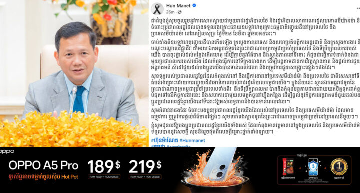 (ភ្នំពេញ)៖ សម្តេចមហាបវរធិបតី ហ៊ុន ម៉ាណែត នៅថ្ងៃទី២៩ ខែមីនានេះ បានចេញសារចូលរួមនូវការសោកស្តាយជាមួយរាជរដ្ឋាភិបាលថៃ និងរដ្ឋាភិបាលសាធារណរដ្ឋសហភាពមីយ៉ាន់ម៉ា និងចំពោះប្រជាពលរដ្ឋដែលបានទទួលរងគ្រោះដោយឧបទ្ទវហេតុគ្រោះធម្មជាតិរញ្ជួយដីនៅប្រទេសថៃ និងប្រទេសមីយ៉ាន់ម៉ា។ ដោយខ្លឹមសារទាំងមូលនៅខាងក្រោមនេះ៖ «ជាដំបូងខ្ញុំសូមចូលរួមនូវការសោកស្តាយជាមួយរាជរដ្ឋាភិបាលថៃ និងរដ្ឋាភិបាលសាធារណរដ្ឋសហភាពមីយ៉ាន់ម៉ា និងចំពោះប្រជាពលរដ្ឋដែលបានទទួលរងគ្រោះដោយឧបទ្ទវហេតុគ្រោះធម្មជាតិរញ្ជួយដីនៅប្រទេសថៃ និងប្រទេសមីយ៉ាន់ម៉ា នៅរសៀលសុក្រ ថ្ងៃទី២៨ ខែមីនា ឆ្នាំ២០២៥នេះ។ ចាប់តាំងពីឧបទ្ទវហេតុរញ្ជួយដីបានកើតឡើង ក្រសួងការបរទេស និងសហប្រតិបត្តិការអន្តរជាតិ និងក្រសួងការងារ និងបណ្តុះបណ្តាលវិជ្ជាជីវ: តាមរយ:ឯកអគ្គរាជទូតនៃព្រះរាជាណាចក្រកម្ពុជាប្រចាំប្រទេសថៃ និងទីប្រឹក្សាពលកររបស់យើង បានចុះផ្ទាល់ដល់កន្លែងកើតហេតុ ដើម្បីក្តាប់នូវព័ត៌មាន និងស្ថានភាពនៅទីនោះ ក៏ដូចជាធ្វើការទំនាក់ទំនងជាមួយប្រជាពលកររបស់យើង ដែលកំពុងធ្វើការនៅទីក្រុងបាងកក ដើម្បីបន្តតាមដានការវិវត្តស្ថានភាព និងផ្តល់ការជួយអន្តរាគមន៍ សំដៅជួយដល់បងប្អូនយើងបានទាន់ពេលវេលា