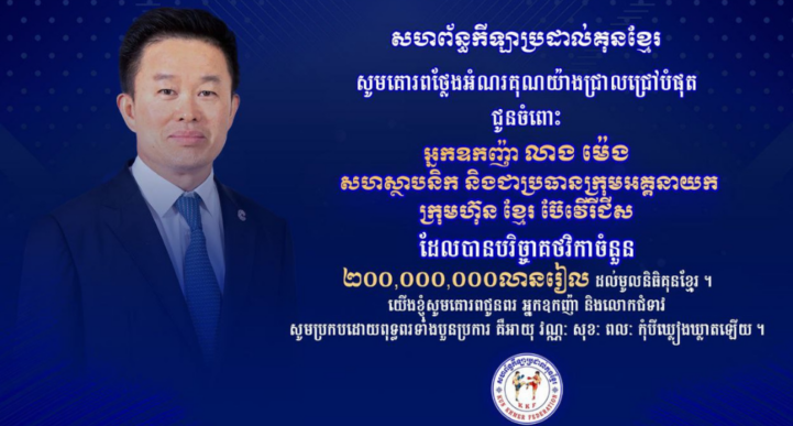 ភ្នំពេញ៖ កាលពីថ្ងៃទី២៦ ខែតុលា ឆ្នាំ២០២៤ សហព័ន្ធកីឡាប្រដាល់គុនខ្មែរ បានបង្ហាញនូវសេចក្តីរីករាយជាពន់ពេក ដោយបានថ្លែងអំណរគុណទៅកាន់ អ្នកឧកញ៉ា លាង ម៉េង សហស្ថាបនិក និងជាប្រធានក្រុមអគ្គនាយកក្រុមហ៊ុន ខ្មែរ ប៊ែវើរីជីស ដែលបានធ្វើការបរិច្ចាគថវិកាដល់ទៅ ២០០លានរៀល ដល់មូលនិធិគុនខ្មែរ ក្នុងការជួយកីឡាករ និងក្លឹបដែលកំពុងខ្វះខាតទូទាំងប្រទេសកម្ពុជា។ តាមរយៈការផ្សព្វផ្សាយនៅលើទំព័រហ្វេសប៊ុកផ្លូវការរបស់សហព័ន្ធកីឡាប្រដាល់គុនខ្មែរ កាលពីរសៀលថ្ងៃទី២៦ ខែតុលា ឆ្នាំ២០២៤ មានខ្លឹមសារយ៉ាងដូច្នេះថា៖ “ក្នុងនាមគណៈកម្មការប្រតិបត្តិ មន្ត្រីបច្ចេកទេស និងកីឡាករ កីឡាការិនីនៃសហព័ន្ធកីឡាប្រដាល់គុនខ្មែរ សូមគោរពថ្លែងអំណរគុណយ៉ាងជ្រាលជ្រៅ ជូនចំពោះ អ្នកឧកញ៉ា លាង ម៉េង និងលោកជំទាវ