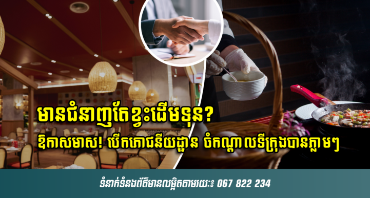 មានក្តីស្រមៃចង់បើកភោជនីយដ្ឋានផ្ទាល់ខ្លួនតែមិនមានដើមទុនគ្រប់គ្រាន់ ឬចង់បើកដែរតែពិបាករកទីតាំងដែលល្អ? ថ្ងៃនេះយើងមានសេចក្តីរំភើបរីករាយក្នុងការផ្តល់ជូននូវឱកាសក្លាយជាដៃគូអាជីវកម្មផ្តាច់មុខក្នុងការគ្រប់គ្រង និងបើកដំណើរការភោជនីយដ្ឋាននៅចំកណ្តាលទីក្រុងភ្នំពេញដ៏មានសក្តានុពល។ ចំពោះដៃគូអាជីវកម្មដែលមានជំនាញគ្រប់គ្រងភោជនីយដ្ឋានច្បាស់លាស់ យើងមានការផ្តល់ជូននូវ អត្ថប្រយោជន៍ជាច្រើនដូចជាទីតាំងល្អៗ និងធំទូលាយដែលយើងមានស្រាប់អបជាមួយហេដ្ឋារចនាសម្ព័ន្ធដែលមានការតុបតែងលម្អ ព្រមទាំងចង្ក្រាន និងសម្ភារៈប្រើប្រាស់សព្វគ្រប់ សម្រាប់បើកដំណើរការភោជនីយដ្ឋានបានភ្លាមៗ ជាពិសេស ផ្តល់ភាពងាយស្រួលសម្រាប់លោកអ្នកដោយមិនចាំបាច់ត្រូវចំណាយដើមទុនវិនិយោគធ្វើហាងថ្មីឡើយ។ មិនតែប៉ុណ្ណោះ លោកអ្នកក៏អាចជ្រើសរើសបើកដំណើរការភោជនីយដ្ឋានក្នុងក្តីស្រមៃ ដែលសមស្របនៅនឹងបទពិសោធន៍ ជំនាញ និងកេរ្តិ៍ឈ្មោះអាជីវកម្មរបស់លោកអ្នកបានថែមទៀតផង។ អត្ថប្រយោជន៍ 1. ចាប់ផ្តើមអាជីវកម្មដោយមិនចាំបាច់ត្រូវចំណាយដើមទុនធ្វើហាង ការប្រើប្រាស់ហេដ្ឋារចនាសម្ព័ន្ធដែលមានស្រាប់ រួមទាំងសម្ភារៈផ្ទះបាយ ការតុបតែងលម្អ កន្លែងទទួលទានអាហារ និងមានបុគ្គលិកដែលមានបទពិសោធន៍ ដើម្បីចាប់ផ្តើមអាជីវកម្មបានភ្លាមៗ ដោយទំនុកចិត្ត។ 2. ចំណុចទីតាំងល្អ ទទួលបានទីតាំងល្អៗ ស្ថិតនៅក្នុងផ្សារទំនើប ចំកណ្តាលទីក្រុង ជាមួយបរិវេណធំទូលាយ
