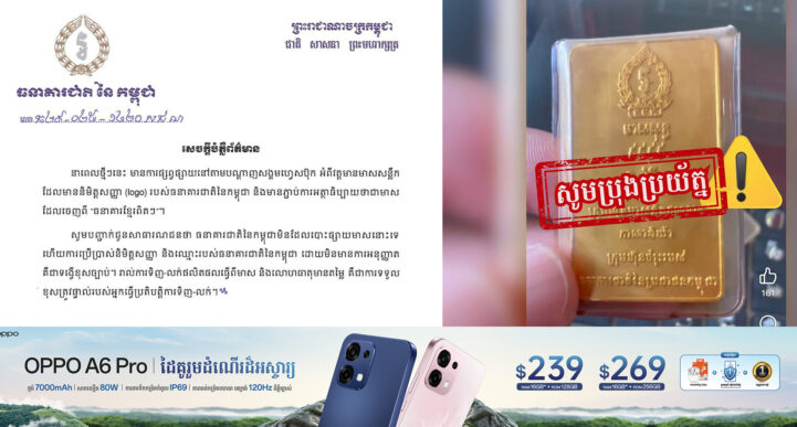 ធនាគារជាតិនៃកម្ពុជា បញ្ជាក់ថាមិនដែលបោះផ្សាយមាសនោះទេ ហើយការប្រើប្រាស់និមិត្តសញ្ញា និងឈ្មោះរបស់ធនាគារជាតិនៃកម្ពុជា ដោយមិនមានការអនុញ្ញាត គឺជាទង្វើខុសច្បាប់។ រាល់ការទិញ-លក់ផលិតផលធ្វើពីមាស និងលោហធាតុមានតម្លៃ គឺជាការទទួល ខុសត្រូវផ្ទាល់របស់អ្នកធ្វើប្រតិបត្តិការទិញ-លក់។ ក្នុងសេចក្តីបំភ្លឺព័ត៌មាន ធនាគារជាតិនៃកម្ពុជា បញ្ជាក់ថា «នាពេលថ្មីៗនេះ មានការផ្សព្វផ្សាយនៅតាមបណ្តាញសង្គមហ្វេសប៊ុក អំពីវត្តមានមាសសន្លឹក ដែលមាននិមិត្តសញ្ញា (logo) របស់ធនាគារជាតិនៃកម្ពុជា និងមានភ្ជាប់ការអត្ថាធិប្បាយថាជាមាស ដែលចេញពី “ធនាគារខ្មែរពិតៗ”។ សូមបញ្ជាក់ជូនសាធារណជនថា ធនាគារជាតិនៃកម្ពុជាមិនដែលបោះផ្សាយមាសនោះទេ ហើយការប្រើប្រាស់និមិត្តសញ្ញា និងឈ្មោះរបស់ធនាគារជាតិនៃកម្ពុជា ដោយមិនមានការអនុញ្ញាត គឺជាទង្វើខុសច្បាប់។ រាល់ការទិញ-លក់ផលិតផលធ្វើពីមាស និងលោហធាតុមានតម្លៃ គឺជាការទទួល ខុសត្រូវផ្ទាល់របស់អ្នកធ្វើប្រតិបត្តិការទិញ-លក់»៕