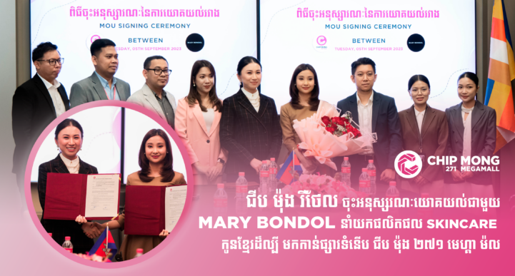 (ភ្នំពេញ ០៥ កញ្ញា ២០២៣)៖ លោកជំទាវ លី សុខឆេង អគ្គនាយិកានៃ ក្រុមហ៊ុន ជីប ម៉ុង រីថៃល បានចុះហត្ថលេខាលើអនុស្សរណៈយោគយល់ ជាមួយនឹងលោកស្រី ម៉ៅ ម៉ារីយន្នីកា សហស្ថាបនិកនៃក្រុមហ៊ុន ម៉ារីបណ្តូល ឯ.ក ដើម្បីនាំយកផលិតផលថែរក្សាសម្ផស្សដ៏ល្បីមកកាន់ផ្សារទំនើប ជីប ម៉ុង ២៧១ មេហ្គា ម៉ល។ ពិធីចុះហត្ថលេខាលើអនុស្សរណៈយោគយល់នេះបានធ្វើឡើងនៅថ្ងៃទី០៥ ខែកញ្ញា ឆ្នាំ២០២៣ នៅផ្សារទំនើប ជីប ម៉ុង ២៧១ មេហ្គា ម៉ល