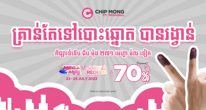 (ភ្នំពេញ កក្កដា ២០២៣)៖ នាថ្ងៃទី២៣ ខែកក្កដា ឆ្នាំ២០២៣ ដ៏ខ្លីខាងមុខនេះ បងប្អូនដែលមានឈ្មោះក្នុងបញ្ជីបោះឆ្នោត សូមបំពេញកាតព្វកិច្ចជាពលរដ្ឋល្អ ទៅបោះឆ្នោតជ្រើសតាំងតំណាងរាស្ត្រ អាណត្តិទី៧ ឱ្យបានគ្រប់ៗគ្នា។ ក្នុងឱកាសនេះ នៅផ្សារទំនើបជីប ម៉ុង 271 មេហ្គា ម៉ល ក៏មានប្រូម៉ូសិនពិសេស សម្រាប់បងប្អូនដែលនៅក្នុងទីក្រុងភ្នំពេញ ក្រោយពីបានបំពេញកាតព្វកិច្ចជាពលរដ្ឋល្អ បោះឆ្នោតរួចរាល់នោះ ក៏ជាពេលវេលានាំក្រុមគ្រួសារទៅដើរលេងកម្សាន្ត ទិញទំនិញ ទទួលទានអាហារ នៅផ្សារទំនើបជីប ម៉ុង 271 មេហ្គា ម៉ល ជាមួយការបញ្ចុះតម្លៃរហូតដល់ ៧០% ពីហាងម៉ាកល្បីៗជាច្រើន។ លើសពីនេះអតិថិជនដែលចំណាយចាប់ពី
