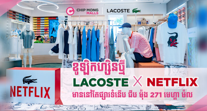 កាលពីពាក់កណ្តាលខែឧសភាកន្លងទៅថ្មីៗនេះ ម៉ាកយីហោម៉ូដសម្លៀកបំពាក់ដ៏ល្បីពីប្រទេសបាំរាំង Lacoste បានពង្រីកសាខាថ្មីរបស់ខ្លួននៅឯផ្សារទំនើប ជីប ម៉ុង ២៧១ មេហ្គា ម៉ល ជាមួយនឹងការដាក់ចេញលក់នូវខូឡិកហ្សិនថ្មីគឺ Lacoste x Netflix។ ជារឿងមួយដ៏គួរឲ្យភ្ញាក់ផ្អើល និងរំភើបក្រោយ Netflix និង Lacoste បានសហការរួមគ្នាប្រកបដោយភាពច្នៃប្រតិដ្ឋក្នុងការបញ្ចេញនូវខូឡិកហ្សិនថ្មី ដែលអបអរចក្រវាលដ៏អស្ចារ្យមួយចំនួននៃភាពយន្តភាគដែលជាទីពេញនិយមបំផុតរួមមាន Stranger Things, Bridgerton, Lupin, Money Heist, The Witcher, Sex Education, Shadow & Bone រួមនិង