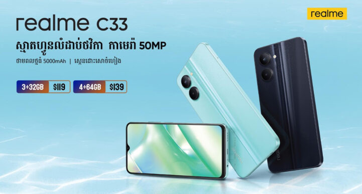realme ប្រចាំប្រទេសកម្ពុជាបានប្រកាសជាផ្លូវការនូវ ស្មាតហ្វូនលំដាប់ថវិកាដែលពេញនិយមបំផុតរបស់ខ្លួនគឺ realme C33 នៅក្នុងទីផ្សារកម្ពុជាយើង ដែលមានមានរាងស្អាតទាក់ភ្នែក ជាមួយតម្លៃមិនគួរឲ្យជឿត្រឹមតែ 119 ដុល្លារ សម្រាប់ទំំហំផ្ទុក 3+32GB និង 139 ដុល្លារ សម្រាប់ទំំហំផ្ទុក 4+64GB ។ realme C33 មានលក្ខណៈសម្បត្តិ និងសមត្ថភាពលើសពីតម្លៃរបស់វា ដើម្បីផ្តល់នូវបទពិសោធន៍ដ៏អស្ចារ្យសម្រាប់អ្នកប្រើប្រាស់វ័យក្មេង ភ្ជាប់មកជាមួយ ការរចនាទាន់សម័យ កាមេរ៉ាធំ50MP អេក្រង់ចបាស់ 6.5″ HD+, ថាមពលថ្មធំ 5000mAh, បន្ទះឈីបខ្លាំង Unisoc T612