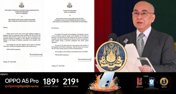 រាជធានីភ្នំពេញ៖ ព្រះករុណា ព្រះមហាក្សត្រ ថ្វាយព្រះរាជសារចំពោះ ព្រះមហាក្សត្រថៃ និងជូន មេដឹកនាំមីយ៉ាន់ម៉ា ចំពោះគ្រោះធម្មជាតិរញ្ជួយដីដ៏រន្ធត់។ ព្រះករុណាជាអម្ចាស់ជីវិតលើត្បូង ព្រះបាទសម្តេចព្រះបរមនាថ នរោត្តម សីហមុនី ព្រះមហាក្សត្រ នៃព្រះរាជាណាចក្រកម្ពុជា ជាទីគោរពសក្ការៈដ៏ខ្ពង់ខ្ពស់បំផុត ព្រះអង្គបានសព្វព្រះរាជហឫទ័យ ប្រោសព្រះរាជទានព្រះរាជសារលិខិតថ្វាយ ព្រះករុណា MAHA VAJIRALONGKORN ព្រះមហាក្សត្រ នៃព្រះរាជាណាចក្រថៃ និងជូនចំពោះ ឯកឧត្តម MIN AUNG HLAING ប្រធានក្រុមប្រឹក្សារដ្ឋ នៃសាធារណរដ្ឋសហភាពមីយ៉ាន់ម៉ា ចំពោះគ្រោះឧបទ្ទវហេតុរញ្ជួយដី ដែលបង្កឲ្យមានការបាត់បង់អាយុជីវិតមនុស្ស និងរងបួស ព្រមទាំងបង្កការខូចខាតជាច្រេីនអនេក ដល់ប្រជាជាតិនៃប្រទេសជាមិត្តទាំង២