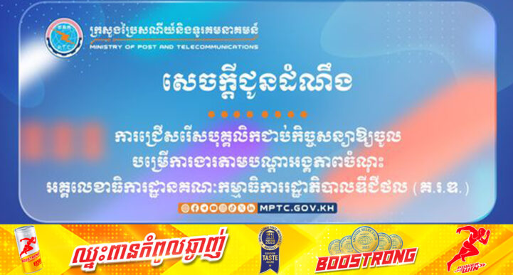 (ភ្នំពេញ)៖ នៅថ្ងៃទី២៧ ខែកក្កដា ឆ្នាំ២០២៤ ក្រសួងប្រៃសណីយ៍ និងទូរគមនាគមន៍ បានចេញសេចក្តីជូនដំណឹង ស្តីពី ការជ្រើសរើសបុគ្គលិកជាប់កិច្ចសន្យាឱ្យចូលបម្រើការងារតាមបណ្តាអង្គភាពចំណុះអគ្គលេខាធិការដ្ឋានគណៈកម្មាធិការរដ្ឋាភិបាលឌីជីថល (គ.រ.ឌ.)។ ខាងក្រោមនេះ ជាសេចក្ដីជូនដំណឹងទាំងស្រុង៖ ប្រភព៖ ក្រសួងប្រៃសណីយ៍ និងទូរគមនាគមន៍ – Ministry of Post and Telecommunications