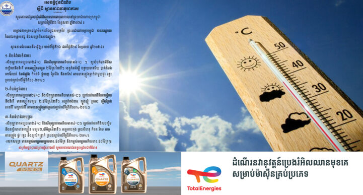 (ភ្នំពេញ)៖ នៅថ្ងៃទី២៦ ខែឧសភា ឆ្នាំ២០២៤ យោងតាមការចុះផ្សាយរបស់ក្រសួងធនធានទឹក និងឧតុនិយម បានឲ្យដឹងថា ចាប់ពីថ្ងៃទី២៦ ដល់ថ្ងៃទី ២៨ នៅតំបន់មួយចំនួន កម្ដៅនឹងហក់ឡើងដល់ ៣៦°C នឹងអាចមានភ្លៀងធ្លាក់ជាមួយផ្គរ រន្ទះ និងខ្យល់កន្ត្រាក់គ្របដណ្ដប់លើផ្ទៃដី១០-២០%។ ក្រសួងបានបញ្ជាក់ថា សម្ពាធទាបគ្រប់ដណ្ដប់មកលើឈូងសមុទ្រថៃ ព្រះរាជាណាចក្រកម្ពុជា ភាគកណ្ដាលនៃអាងទន្លេមេគង្គ និងសមុទ្រចិនខាងត្បូង។ ស្ថានភាពបែបនេះនឹងធ្វើឱ្យ ចាប់ពីថ្ងៃទី២៦ ដល់ថ្ងៃទី២៨ ខែឧសភា ឆ្នាំ២០២៤៖ ១-តំបន់វាលទំនាប៖ – សីតុណ្ហភាពអប្បបរមា ២៤°C និងសីតុណ្ហភាពអតិបរមា៣៦°C ។ ខ្យល់បក់មកពីទិសទក្សិណ និងនិរតី