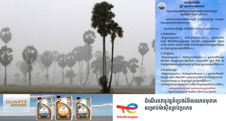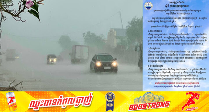 (ភ្នំពេញ)៖ ក្រសួងធនធានទឹក និងឧតុនិយម បានចេញសេចក្តីជូនដំណឹង អំពីស្ថានភាពធាតុអាកាសនៅកម្ពុជា សម្រាប់ថ្ងៃទី១៩ ខែឧសភា ឆ្នាំ២០២៤។ ក្រសួងបានបញ្ជាក់ថា សម្ពាធទាបគ្របដណ្ដប់មកលើឈូងសមុទ្រថៃ ព្រះរាជាណាចក្រកម្ពុជា ភាគកណ្តាលនៃអាងទន្លេមេគង្គ និងសមុទ្រចិនខាងត្បូង។ ស្ថានភាពបែបនេះនឹងធ្វើឱ្យ ចាប់ពីថ្ងៃទី១៩ ដល់ថ្ងៃទី២១ ខែឧសភា ឆ្នាំ២០២៤៖ ១-តំបន់វាលទំនាប៖ – សីតុណ្ហភាពអប្បបរមា ២៤°C និងសីតុណ្ហភាពអតិបរមា៣៥°C ។ ខ្យល់បក់មកពីទិសអាគ្នេយ៍ និងទិសនិរតី មានល្បឿនមធ្យម ២ ម៉ែត្រ/វិនាទី។ ខេត្តបន្ទាយមានជ័យ សៀមរាប បាត់ដំបង ពោធិ៍សាត់ កំពង់ចាម