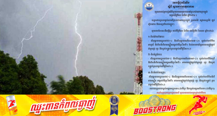 (ភ្នំពេញ)៖ នៅថ្ងៃទី៣១ ខែមីនា ឆ្នាំ២០២៤ យោងតាមការចុះផ្សាយរបស់ក្រសួងធនធានទឹក និងឧតុនិយម បានឱ្យដឹងថា ពីថ្ងៃនេះរហូតដល់ថ្ងៃទី២ ខែមេសា និងមានភ្លៀងធ្លាក់ ដោយសារតែសម្ពាធទាបគ្របដណ្ដប់មកលើព្រះរាជាណាចក្រកម្ពុជា ប្រទេសថៃ ឈូងសមុទ្រថៃ ឡាវ វៀតណាម និងសមុទ្រចិនខាងត្បូង។ ស្ថានភាពបែបនេះនឹងធ្វើឱ្យ៖ ចាប់ពីថ្ងៃទី៣១ ខែមីនា ដល់ថ្ងៃទី២ ខែមេសា ឆ្នាំ២០២៤៖ ១. តំបន់វាលទំនាប ៖ – សីតុណ្ហភាពអប្បបរមា២៦°C និងសីតុណ្ហភាពអតិបរមា៣៧°C។ ខ្យល់បក់មកពីទិសអាគ្នេយ៍ និងទិសនិរតីមានល្បឿនមធ្យម២ម៉ែត្រ/វិនាទី។ តំបន់ភាគពាយ័ព្យអាចមានភ្លៀងធ្លាក់ជាមួយផ្គរ រន្ទះ និងខ្យល់កន្ត្រាក់គ្របដណ្ដប់លើផ្ទៃដី៣០%។ ២.តំបន់ខ្ពង់រាប