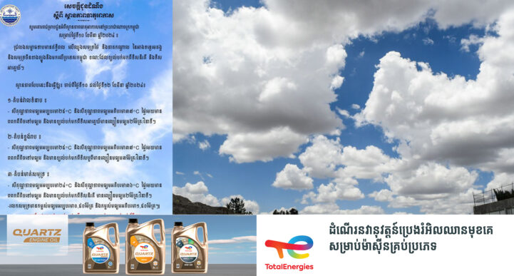 (ភ្នំពេញ)៖ ថ្ងៃទី១០ ខែមីនា ឆ្នាំ២០២៤ ក្រសួងធនធានទឹក និងឧតុនិយម បានចេញនូវសេចក្ដីជូនដំណឹង ស្ដីពី ស្ថានភាពអាកាសធាតុ នឹងមានការកើនសីតុណ្ហភាពមធ្យមអប្បបរមា២៥°C និងសីតុណ្ហភាពមធ្យមអតិបរមា៣៧°C ដោយសារតែជ្រលងសម្ពាធទាបមានឥទ្ធិពល លើឈូងសមុទ្រថៃ និងភាគកណ្តាល នៃអាងទន្លេមេគង្គ និងសមុទ្រចិនខាងត្បូងនិងមកលើប្រទេសកម្ពុជា ខណៈដែលខ្យល់បក់មកពីទិសនិរតី និងទិសអាគ្នេយ៍។ ស្ថានភាពបែបនេះនឹងធ្វើឱ្យ៖ ចាប់ពីថ្ងៃទី១០ ដល់ថ្ងៃទី១២ ខែមីនា ឆ្នាំ២០២៤៖ ១. តំបន់វាលទំនាប ៖ ⁃ សីតុណ្ហភាពមធ្យមអប្បបរមា២៥°C និងសីតុណ្ហភាពមធ្យមអតិបរមា៣៧°C ផ្ទៃមេឃមានពពកពីតិចទៅមធ្យម និងមានខ្យល់បក់មកពីទិសអាគ្នេយ៍មានល្បឿនមធ្យម២ម៉ែត្រ/វិនាទី។ ២.តំបន់ខ្ពង់រាប ៖ ⁃