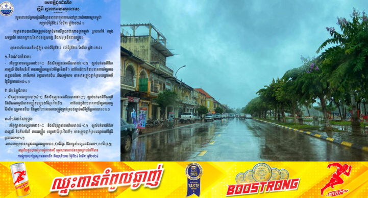 (ភ្នំពេញ)៖ នៅថ្ងៃទី២៤ ខែមីនា ឆ្នាំ២០២៤ ក្រសួងធនធានទឹក និងឧតុនិយម បានចេញសេចក្ដីជូនដំណឹង ស្ដីពី ស្ថានភាពអាកាសធាតុ ចាប់ពីថ្ងៃទី២៤ ដល់ថ្ងៃទី២៦ អាចនឹងមានភ្លៀងធ្លាក់គ្របដណ្ដប់លើផ្ទៃដី បណ្ដាលមកពីសម្ពាធទាប បាននិងបន្តគ្របដណ្ដប់មកលើព្រះរាជាណាចក្រកម្ពុជា ប្រទេសថៃ ឈូងសមុទ្រថៃ ភាគកណ្តាលនៃអាងទន្លេមេគង្គ និងសមុទ្រចិនខាងត្បូង។ ស្ថានភាពបែបនេះនឹងធ្វើឱ្យ៖ ចាប់ពីថ្ងៃទី២៤ ដល់ថ្ងៃទី២៦ ខែមីនា ឆ្នាំ២០២៤៖ ១. តំបន់វាលទំនាប ៖ ⁃ សីតុណ្ហភាពអប្បបរមា២៦°C និងសីតុណ្ហភាពអតិបរមា៣៦°C។ ខ្យល់បក់មកពីទិសអាគ្នេយ៍ និងទិសនិរតី មានល្បឿនមធ្យម២ម៉ែត្រ/វិនាទី។ នៅតំបន់វាលទំនាបភាគពាយ័ព្យមានខេត្តបាត់ដំបង ពោធិ៍សាត់