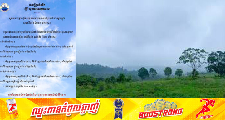 (ភ្នំពេញ)៖ ថ្ងៃទី១៤ ខែមករា ២០២៤ ក្រសួងធនធានទឹក និងឧតុនិយម បានចេញសេចក្ដីជូនដំណឹង ស្ដីពី ស្ថានភាពអាកាសធាតុ ទ្រនុងសម្ពាធខ្ពស់ពីប្រទេសចិនបង្កើនឥទ្ធិពលគ្របដណ្តប់មកលើភាគឦសាននិងភាគខាងកើតប្រទេសកម្ពុជា ជាមួយនឹងខ្យល់មូសុងឦសានបក់ពីខ្សោយទៅមធ្យម។ ស្ថានភាពបែបនេះនឹងធ្វើឱ្យ៖ ចាប់ពីថ្ងៃទី១៤ ដល់ថ្ងៃទី២០ ខែមករា ឆ្នាំ២០២៤៖ ១-តំបន់វាលទំនាប ៖ ⁃ សីតុណ្ហភាពអប្បបរមាពី២១-២៣°C និងសីតុណ្ហភាពអតិបរមាពី៣៣-៣៥°C ហើយខ្យល់បក់មកពីទិសឦសាន ក្នុងល្បឿនពី២-៤ម៉ែត្រ/វិនាទី។ ២-តំបន់ខ្ពង់រាប ៖ ⁃ សីតុណ្ហភាពអប្បបរមាពី១៦-២២°C សីតុណ្ហភាពអតិបរមាពី៣២-៣៤°C ហើយខ្យល់បក់មកពីទិសឦសាន ក្នុងល្បឿនពី៣-៦ម៉ែត្រ/វិនាទី ⁃ ខេត្តមណ្ឌលគិរី រតនគិរី និងខេត្តព្រះវិហារ