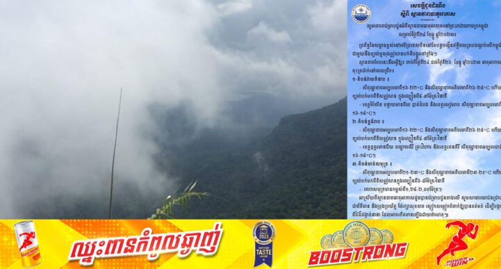 (ភ្នំពេញ)៖ នៅថ្ងៃទី២៤ ខែធ្នូ ឆ្នាំ២០២៣ យោងតាមការចុះផ្សាយរបស់ ក្រសួងធនធានទឹក និងឧតុនិយម បានចេញសេចក្ដីជូនដំណឹងស្ដីពីស្ថានភាពអាកាសធាតុនៅកម្ពុជា សីតុណ្ហភាពអប្បបរមាពី១៦-២២°C និងរលកសមុទ្រអាចមានកម្ពស់ពី១,២៥-២,០០ម៉ែត្រ។ ប្រព័ន្ធសម្ពាធខ្ពស់នៅលើប្រទេសចិននៅតែបន្តបង្កើនឥទ្ធិពលគ្របដណ្តប់លើប្រទេសកម្ពុជា ជាមួយនឹងខ្យល់មូសុងឦសានបក់ពីបង្គួរទៅខ្លាំង។ ស្ថានភាពបែបនេះនឹងធ្វើឱ្យ៖ ចាប់ពីថ្ងៃទី២៤ ដល់ថ្ងៃទី២៦ ខែធ្នូ ឆ្នាំ២០២៣ ធាតុអាកាសបន្តចុះត្រជាក់នៅពេលព្រឹក៖ ១-តំបន់វាលទំនាប ៖ ⁃ សីតុណ្ហភាពអប្បបរមាពី១៦-២២°C និងសីតុណ្ហភាពអតិបរមាពី២៦-២៨°C ហើយខ្យល់បក់មកពីទិសឦសាន ក្នុងល្បឿនពី៥-៧ម៉ែត្រ/វិនាទី ⁃ខេត្តប៉ៃលិន បន្ទាយមានជ័យ បាត់ដំបង និងខេត្តសៀមរាប សីតុណ្ហភាពអប្បបរមាពី១៦-១៨°C។ ២-តំបន់ខ្ពង់រាប ៖ ⁃ សីតុណ្ហភាពអប្បបរមាពី១៦-២២°C