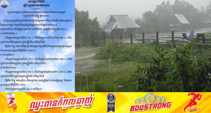(ភ្នំពេញ)៖ នៅថ្ងៃទី៣ ខែធ្នូ ឆ្នាំ២០២៣ ក្រសួងធនធាន និងឧតុនិយម បានចេញសេចក្ដីជូនដំណឹងស្ដីពី អំពីស្ថានភាពធាតុអាកាសនៅរាធានីភ្នំពេញ និងបណ្តាខេត្តនៅប៉ែកខាងត្បូងមានភ្លៀងធ្លាក់ខ្សោយ ដែលអាចគ្របដណ្តប់លើផ្ទៃដីពី២០-៣០%។ បានបន្ថែមទៀតថា ប្រព័ន្ធសម្ពាធខ្ពស់ពីប្រទេសចិនមានឥទ្ធិពលខ្សោយមកលើភាគខាងជើង និងភាគឦសាននៃប្រទេសកម្ពុជា ជាមួយនឹងខ្យល់មូសុងឦសានបក់ពីខ្សោយទៅមធ្យម។ ស្ថានភាពបែបនេះនឹងធ្វើឱ្យធាតុអាកាស ចាប់ពីថ្ងៃទី៣ ដល់ថ្ងៃទី៥ ខែធ្នូ ឆ្នាំ២០២៣ ៖ ១-តំបន់វាលទំនាប ៖ ⁃ សីតុណ្ហភាពអប្បបរមាពី២៤-២៦°C និងសីតុណ្ហភាពអតិបរមាពី៣៣-៣៥°C ហើយខ្យល់បក់មកពីទិសឦសាន ក្នុងល្បឿនពី១-៣ម៉ែត្រ/វិនាទី ⁃ថ្ងៃទី៣ ខែធ្នូ នៅរាធានីភ្នំពេញ និងបណ្តាខេត្តនៅប៉ែកខាងត្បូងមានភ្លៀងធ្លាក់ខ្សោយ ដែលអាចគ្របដណ្តប់លើផ្ទៃដីពី២០-៣០%។ ២-តំបន់ខ្ពង់រាប ៖
