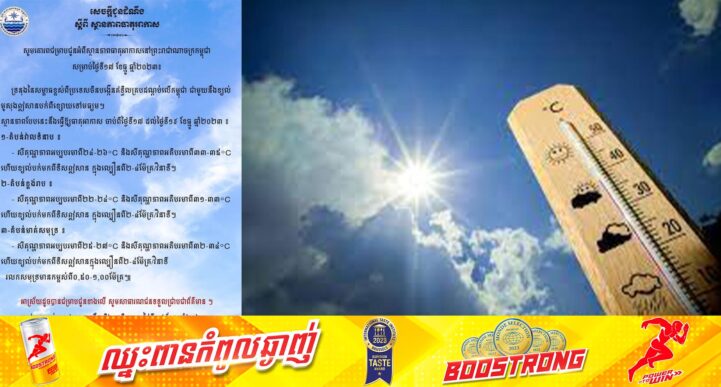 (រាជធានីភ្នំពេញ)៖ នៅថ្ងៃទី ១០ ខែធ្នូ ឆ្នាំ២០២៣ យោងតាមការចុះផ្សាយរបស់ ក្រសួងធនធានទឹក និងឧតុនិយម សេចក្ដីជូនដំណឹង ស្ដីពី ស្ថានភាពអាកាសធាតុ បានឱ្យដឹងថា សីតុណ្ហភាពអប្បបរមាពី២២-២៥°C និងសីតុណ្ហភាពអតិបរមាពី៣២-៣៤°C ហើយខ្យល់បក់មកពីទិសឦសាន ក្នុងល្បឿនពី១-៣ម៉ែត្រ/វិនាទី។ កម្ពុជាបន្តទទួលឥទ្ធិពលខ្សោយពីទ្រនុងសម្ពាធខ្ពស់មកពីប្រទេសចិន ជាមួយនឹងខ្យល់មូសុងឦសានខ្សោយ។ ស្ថានភាពបែបនេះនឹងធ្វើឱ្យធាតុអាកាស ចាប់ពីថ្ងៃទី១០ ដល់ថ្ងៃទី១២ ខែធ្នូ ឆ្នាំ២០២៣ ៖ ១-តំបន់វាលទំនាប ៖ ⁃ សីតុណ្ហភាពអប្បបរមាពី២៤-២៦°C និងសីតុណ្ហភាពអតិបរមាពី៣៣-៣៦°C ហើយខ្យល់បក់មកពីទិសឦសាន ក្នុងល្បឿនពី១-២ម៉ែត្រ/វិនាទី។ ២-តំបន់ខ្ពង់រាប ៖ ⁃