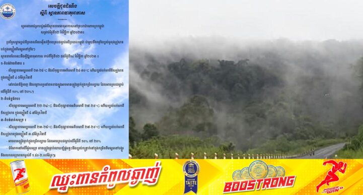 (ភ្នំពេញ)៖ ក្រសួងធនធានទឹក និងឧតុនិយម បានចេញសេចក្តីជូនដំណឹង អំពីស្ថានភាពធាតុអាកាស នៅព្រះរាជាណាចក្រកម្ពុជា សម្រាប់ថ្ងៃទី១២ ខែវិច្ឆិកា ឆ្នាំ២០២៣។ ក្រសួងបញ្ជាក់ថា ប្រព័ន្ធសម្ពាធខ្ពស់ពីប្រទេសចិន បង្កើនឥទ្ធិពលគ្របដណ្តប់លើប្រទេសកម្ពុជា ជាមួយនឹងកម្លាំងខ្យល់មូសុងឦសានបក់ក្នុងល្បឿនពីមធ្យមទៅខ្លាំង។ ស្ថានភាពបែបនេះនឹងធ្វើឱ្យធាតុអាកាស ចាប់ពីថ្ងៃទី១២ ដល់ថ្ងៃទី១៤ ខែវិច្ឆិកា ឆ្នាំ២០២៣៖ ១-តំបន់វាលទំនាប ៖ ⁃ សីតុណ្ហភាពអប្បបរមាពី ២៣-២៥°C និងសីតុណ្ហភាពអតិបរមាពី ២៨-៣០°C ហើយខ្យល់បក់មកពីទិសឦសាន ក្នុងល្បឿនពី ៤-៦ម៉ែត្រ/វិនាទី ⁃ នៅរាជធានីភ្នំពេញ និងបណ្តាខេត្តនៅភាគខាងត្បូងអាចមានភ្លៀងធ្លាក់ក្នុងកម្រិតខ្សោយ ដែលអាចគ្របដណ្តប់លើផ្ទៃដីពី ១០% ទៅ