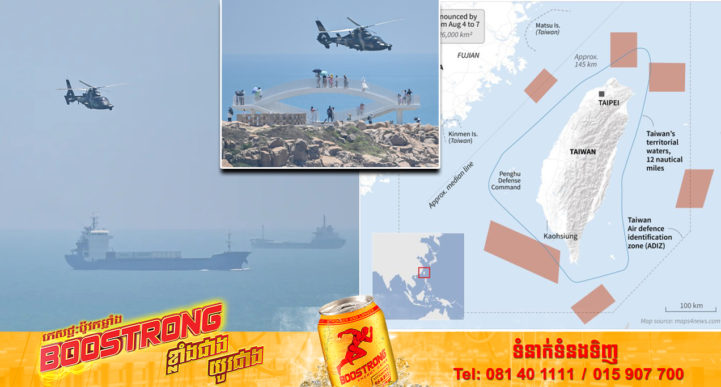 ចិន៖ នៅទីបំផុតចិនបានសម្រេចបើកធ្វើសមយុទ្ធយោធាទ្រង់ទ្រាយធំនៅជុំវិញកោះតៃវ៉ាន់តាមការគ្រោងទុកហើយ នេះបើយោងតាមការចុះផ្សាយរបស់បណ្តាញសារព័ត៌មាន Channel News Asia នៅព្រឹកថ្ងៃព្រហស្បតិ៍ ទី៤ ខែសីហានេះ។ តាមគម្រោងគឺសមយុទ្ធយោធារបស់កងទ័ពចិននឹងចាប់ផ្តើមនៅម៉ោង ១២ថ្ងៃត្រង់ ខណៈនៅក្នុងការធ្វើសមយុទ្ធយោធានោះនឹងមានទាំងសកម្មភាពហ្វឹកហាត់របស់យោធា និងសកម្មភាពបាញ់កាំភ្លើងដោយប្រើគ្រាប់ពិតផងដែរ។ ប្រភពខាងលើបានបន្តថា សមយុទ្ធយោធារបស់កងទ័ពចិននឹងត្រូវរៀបចំឡើងក្នុងទីតាំងដែលមានចម្ងាយប្រមាណជា ២០គីឡូម៉ែត្រពីកោះតៃវ៉ាន់ ពោលគឺនៅតំបន់ដែនសមុទ្រដែលជាផ្លូវទឹកដ៏មមាញឹកមួយរបស់ពិភពលោក។ សូមបញ្ជាក់ជូនថា ចិនបានសម្រេចធ្វើសមយុទ្ធយោធាទ្រង់ទ្រាញធំភ្លាមៗក្រោយលោកស្រី ណាន់ស៊ី ប៉េឡូស៊ី ប្រធានរដ្ឋសភាអាមេរិកបានអញ្ជើញទៅធ្វើទស្សនកិច្ចនៅកោះតៃវ៉ាន់។ ក្រៅតែពីធ្វើសមយុទ្ធយោធា ចិនក៏បានសម្រេចដាក់ទណ្ឌកម្មមួយចំនួនចំពោះកោះតៃវ៉ាន់ផងដែរ ដូចជាចិនបានបិទការនាំចូលផ្លែក្រូចនិងត្រីពីកោះតៃវ៉ាន់ ខណៈចិនបានផ្អាកនាំចេញខ្សាច់ទៅកោះតៃវ៉ាន់ផងដែរ៕ អត្ថបទ៖ ភក្តី ប្រភព៖ Channel News Asia