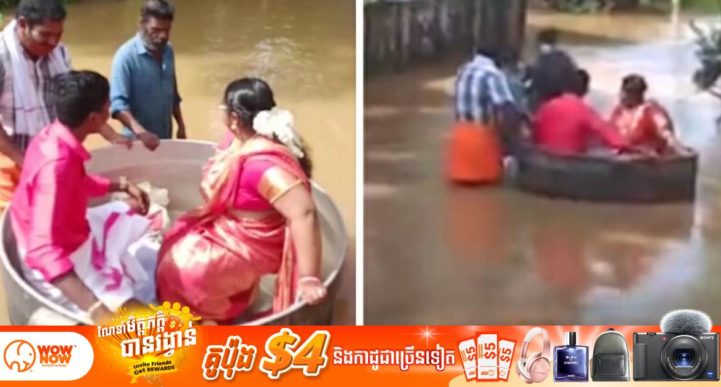 ឥណ្ឌា៖ ជំនន់ទឹកភ្លៀងនៅប្រទេសឥណ្ឌាបានបង្ខំឲ្យកូនកំលោះនិងកូនក្រមុំមួយគូត្រូវជិះខ្ទះធំមួយដើម្បីទៅកន្លែងរៀបការក្រោយពីទឹកបានជន់លិចពេញភូមិយ៉ាងឆាប់រហ័ស ខណៈពលរដ្ឋនៅក្នុងភូមិមិនបានត្រៀមមធ្យោបាយសម្រាប់ធ្វើដំណើរនៅលើទឹកដូចជាទូក ឬក្បូននោះទេ។ បើយោងតាមការចុះផ្សាយនៅក្នុងបណ្តាញសារព័ត៌មាន World of Buzz បានឲ្យដឹងថា ហេតុការណ៍នេះបានកើតឡើងនៅក្នុងភូមិដាច់ស្រយាលមួយនៅក្នុងរដ្ឋ Kerala ភាគខាងជើងនៃប្រទេសឥណ្ឌា។ ប្រភពខាងលើបានបន្តថា តាមគម្រោងគឺអាពាហ៍ពិពាហ៍ខាងលើនេះត្រូវរៀបចំឡើងដោយមានភ្ញៀវជាច្រើនចូលរួម តែដោយសារមានទឹកជំនន់យ៉ាងឆាប់រហ័សដូចនេះគេក៏បានកែប្រែមករៀបចំពិធីបែបតូចតាចវិញដើម្បីកុំឲ្យភ្ញៀវពិបាកធ្វើដំណើរទៅចូលរួមព្រោះសូម្បីតែកន្លែងសម្រាប់រៀបចំពិធីការនោះក៏ត្រូវទឹកជន់លិចផងដែរ។ គួរបញ្ជាក់ថា ជំនន់ទឹកភ្លៀងនៅក្នុងរដ្ឋ Kerala ក្នុងរយៈពេលប៉ុន្មានសប្តាហ៍ចុងក្រោយនេះបានឆក់យកជីវិតពលរដ្ឋឥណ្ឌាចំនួន ២៨នាក់ហើយ ខណៈពលរដ្ឋជាច្រើននាក់ផ្សេងទៀតត្រូវជម្លៀសខ្លួនទៅកាន់ទីទួលសុវត្ថិភាពជាបន្ទាន់ផងដែរ៕ VIDEO A couple in India’s southern state of Kerala use a large cooking