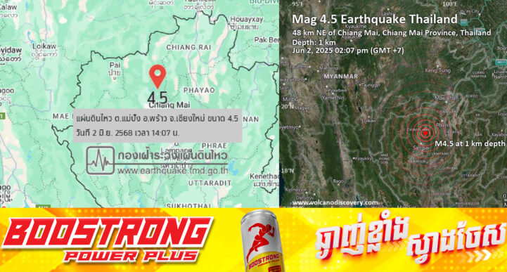 ថៃ៖ ស្រុក Phrao ខេត្តឈៀងម៉ៃ ប្រទេសថៃ បានរងការវាយប្រហារដោយគ្រោះរញ្ជួយដីកម្រិត ៤,៥រ៉ិចទ័រ នេះបើយោងតាមការចុះផ្សាយរបស់បណ្តាញសារព័ត៌មាន បាងកកប៉ុស្តិ៍ នៅក្នុងរសៀលថ្ងៃចន្ទ ទី២ ខែមិថុនា។ គ្រោះរញ្ជួយដីបានបង្កើតឱ្យមានភាពញ័រនៅក្នុងដីជម្រៅប្រមាណជា ១គីឡូម៉ែត្រ និងបានកើតឡើងក្នុងរយៈពេលខ្លីមួយប៉ុណ្ណោះ។ ប្រភពខាងបានបន្តថា ក្នុងពេលកើតមានគ្រោះរញ្ជួញដីខាងលើនេះតំបន់មួយចំនួននៅក្បែរខេត្តឈៀងម៉ៃក៏បានទទួលរងភាពញ័រក្នុងកម្រិតស្រាលផងដែរ។ យ៉ាងណាក្តី រហូតមកទល់នឹងពេលនេះ នៅមិនទាន់មានរបាយការណ៍បង្ហាញថាមានជនរងគ្រោះឬផលប៉ះពាល់យ៉ាងណានៅឡើយទេ។ គួររម្លឹកជូនថា កាលពីប៉ុន្មានសប្តាហ៍មុនទីក្រុងបាងកករបស់ប្រទេសថៃក៏បានទទួលរងការរញ្ជួយដីកម្រិតមធ្យមមួយផងដែរ ដែលបានធ្វើឱ្យអគារមួយកន្លែងត្រូវដួលរលំនិងសម្លាប់មនុស្សអស់ជាច្រើននាក់៕ អត្ថបទ៖ ភក្តី ប្រភព៖ បាងកកប៉ុស្តិ៍
