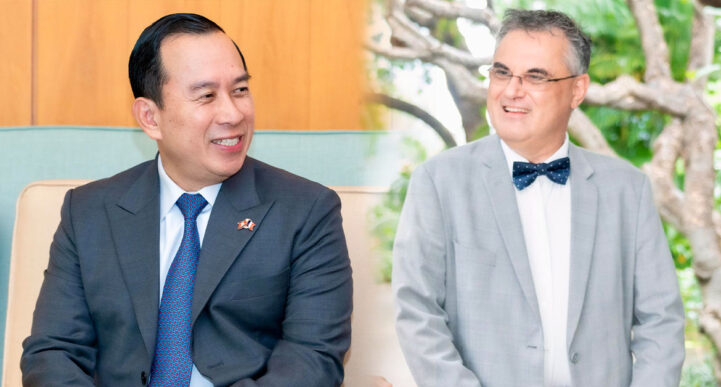 (រាជធានីភ្នំពេញ)៖ ក្រសួងទេសចរណ៍ និងស្ថានទូតបារាំងប្រចាំកម្ពុជា សហការរួមគ្នាអភិវឌ្ឍវិស័យទេសចរណ៍ និងការបណ្តុះបណ្តាលវិជ្ជាជីវៈទេសចរណ៍ឱ្យដល់កម្រិតអន្តរជាតិ។ នៅថ្ងៃទី ៥ ខែធ្នូ ឆ្នាំ ២០២៥ នេះ ឯកឧត្តម ហួត ហាក់ រដ្ឋមន្រ្តីក្រសួងទេសចរណ៍ បានពិភាក្សាការងារជាមួយ ឯកឧត្តម Oliver Richard ឯកអគ្គរដ្ឋទូតវិសាមញ្ញ និងពេញសមត្ថភាពនៃសាធារណរដ្ឋបារាំងប្រចាំកម្ពុជា និងសហការីអំពីការពង្រឹង និងពង្រីកកិច្ចសហប្រតិបត្តិការទេសចរណ៍ នៅស្ថានទូតបារាំងប្រចាំកម្ពុជា។ ក្នុងឱកាសជំនួបដ៏សំខាន់ ឯកឧត្តមឯកអគ្គរដ្ឋទូត បានគូសបញ្ជាក់ជូនអំពីការចូលរួមដ៏សំខាន់របស់ប្រទេសបារាំងក្នុងការអភិវឌ្ឍវិស័យទេសចរណ៍កម្ពុជារហូតមក តាមរយៈគម្រោងសហប្រតិបត្តិការជាច្រើនកន្លងមក និងការសន្យាបន្តជួយបន្ថែមតទៅទៀតក្នុងវិស័យទេសចរណ៍ និងបដិសណ្ឋារកិច្ច។ ជាកិច្ចឆ្លើយតប ឯកឧត្តមរដ្ឋមន្រ្តី បានថ្លែងអំណរគុណ កោតសរសើរ