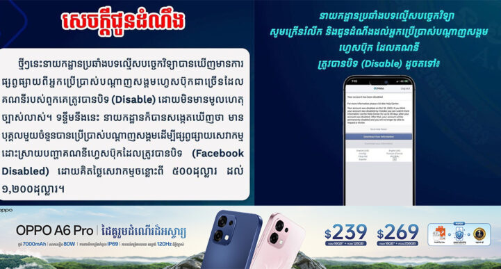 យោងតាម ក្រសួងព័ត៌មាន នាថ្ងៃទី ១៨ ខែតុលា ឆ្នាំ ២០២៥ នេះបានឱ្យដឹងថា នាយកដ្ឋានប្រឆាំងបទល្មើសបច្ចេកវិទ្យា នៃក្រសួងមហាផ្ទៃ បានឱ្យដឹងថាថ្មីៗនេះ មានការផ្សព្វផ្សាយពីអ្នកប្រើប្រាស់បណ្ដាញសង្គមហ្វេសប៊ុកជាច្រើនដែលគណនីរបស់ពួកគេត្រូវបានបិទ (Disable) ដោយមិនមានមូលហេតុច្បាស់លាស់។ ទន្ទឹមនឹងនេះ នាយកដ្ឋានក៏បានសង្កេតឃើញថា មានបុគ្គលមួយចំនួនបានប្រើប្រាស់បណ្ដាញសង្គមដើម្បីផ្សព្វផ្សាយ សេវាកម្មដោះស្រាយបញ្ហាគណនីហ្វេសប៊ុកដែលត្រូវបានបិទ (Facebook Disabled) ដោយគិតថ្លៃសេវាកម្មចន្លោះពី ៥០០ដុល្លារ ដល់ ១,២០០ដុល្លារ។ តាមរយៈបណ្តាញទំនាក់ទំការងារផ្លូវការ នាយកដ្ឋានប្រឆាំងបទល្មើសបច្ចេកវិទ្យា បានក្រើនរំលឹក និងជូនដំណឹងដល់អ្នកប្រើប្រាស់បណ្ដាញសង្គមហ្វេសប៊ុក ដែលគណនីត្រូវបានបិទ (Disable) ដូចតទៅ៖ ១. កុំទាន់បង់ប្រាក់សម្រាប់សេវាកម្មដោះស្រាយបញ្ហាដោយបុគ្គលឯកជន ដោយសារ