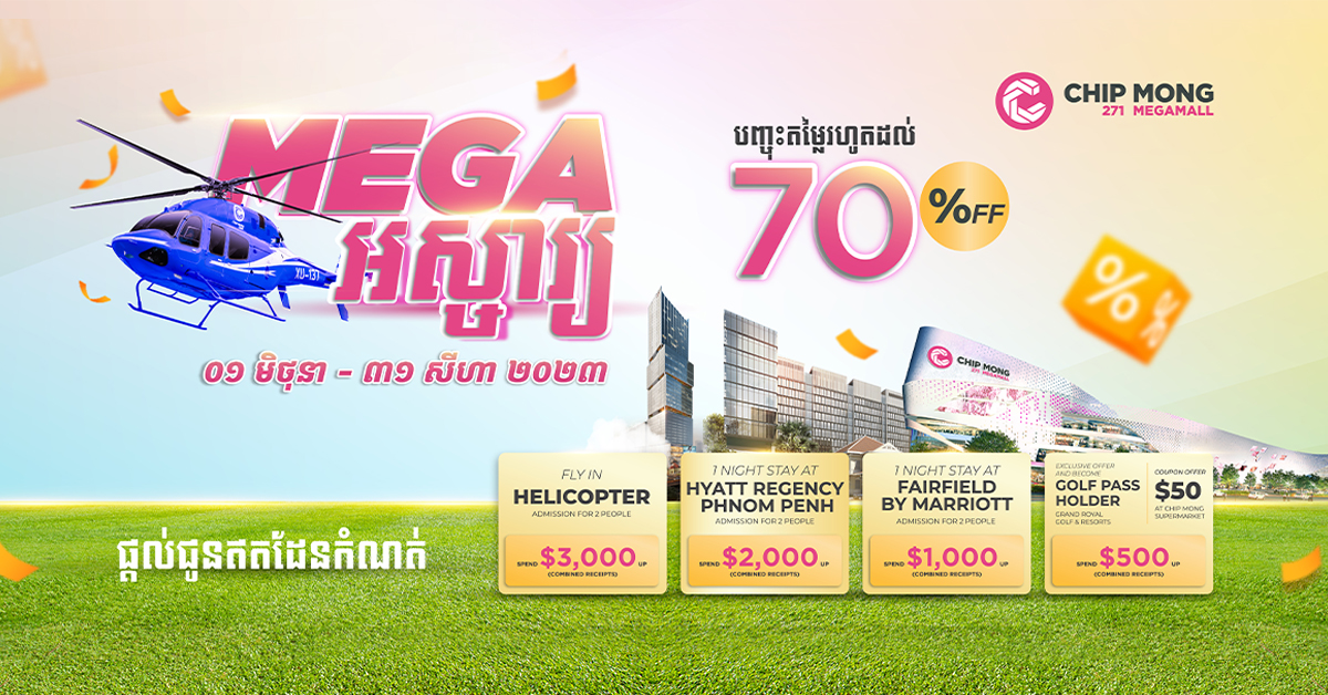កាន់តែសម្បើម! ព្រឹត្តិការណ៍ «Mega អស្ចារ្យ» ពីផ្សារទំនើប ជីប ម៉ុង ២៧១ មេហ្គាម៉ល ទិញទំនិញបញ្ចុះតម្លៃ៧០%ពីហាងល្បីៗ ថែមទាំងមានឱកាស ជិះឧទ្ធម្ភាគចក្រលំដាប់អភិជន និងស្នាក់នៅសណ្ឋាគារលំដាប់ផ្កាយ៥