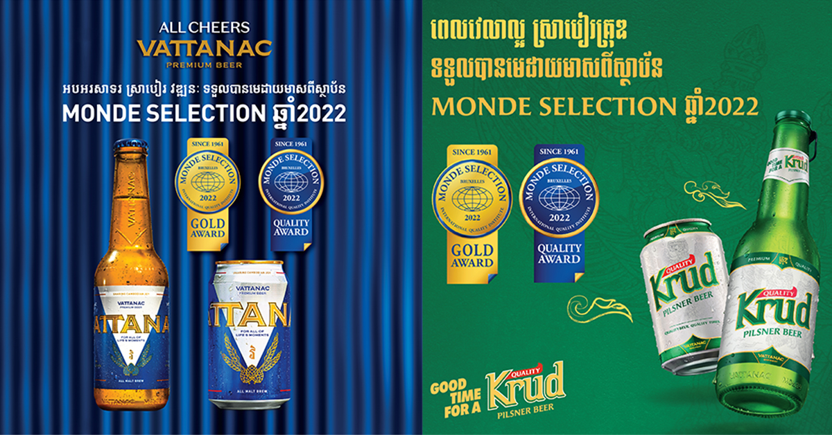 ស្រាបៀរ វឌ្ឍនៈ និង ស្រាបៀរ គ្រុឌ ទទួលបានមេដាយមាស ព្រមគ្នា ពីវិទ្យាស្ថានគុណភាពអន្តរជាតិ MONDE SELECTION ប្រចាំឆ្នាំ ២០២២