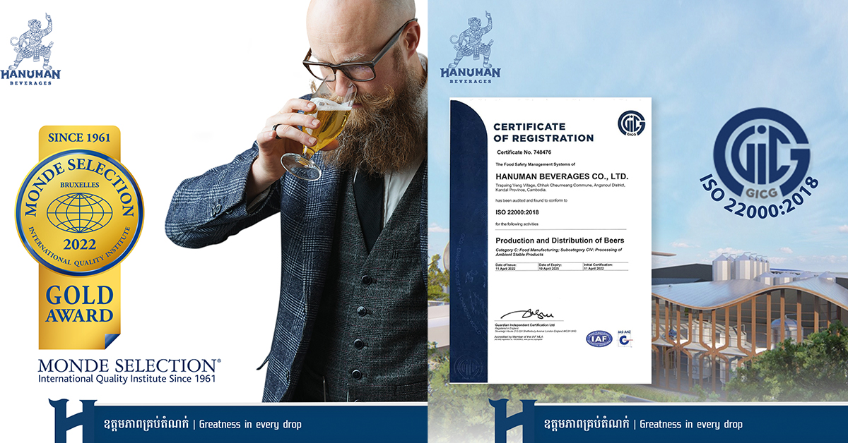 ក្រុមហ៊ុន ហនុមាន ប៊ែវើរីជីស ឈ្នះពានរង្វាន់មេដាយមាស Gold Quality Award ពី Monde Selection និងវិញ្ញាបនបត្រគុណភាពខ្ពស់ ISO Certificate ប្រចាំឆ្នាំ 2022!