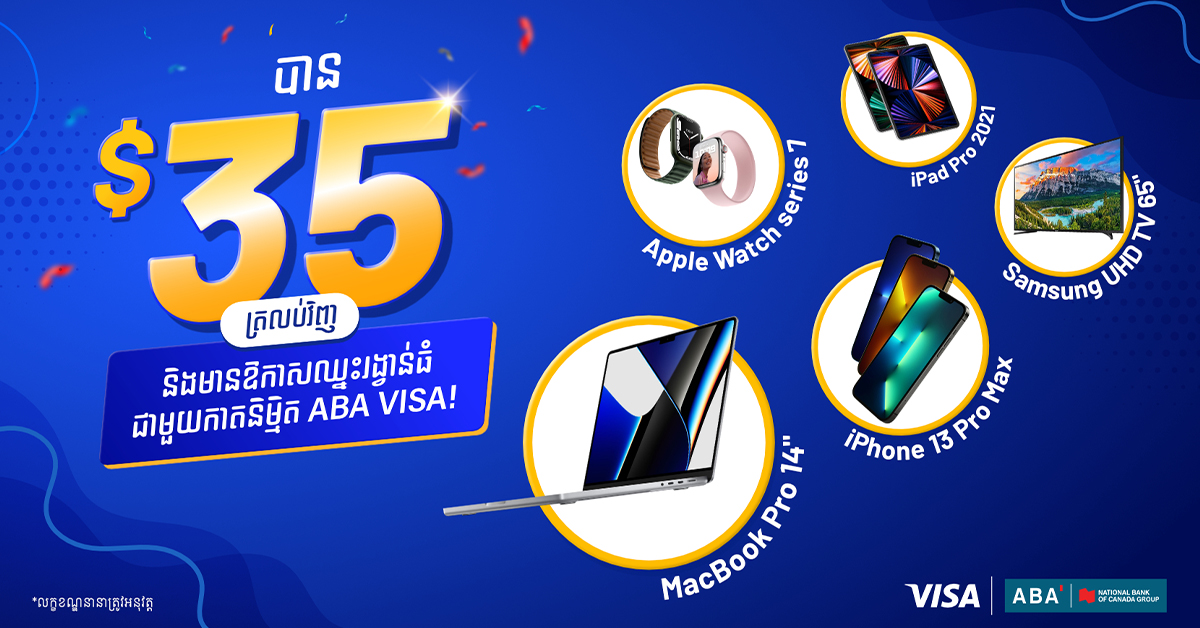 ទទួលបានទឹកប្រាក់ត្រឡប់ $35 ជាមួយកាតនិម្មិត ABA Visa ហើយមានឱកាសឈ្នះរង្វាន់ធំ!
