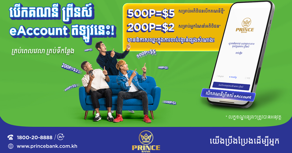 ថ្មី! គណនីព្រីនស៍ eAccount ផ្តល់ជូននូវធនាគារឌីជីថលដែលមានភាពងាយស្រួល និងសុវត្ថិភាពដល់អតិថិជន មាននៅលើកម្មវិធី PRINCE Mobile ហើយ!
