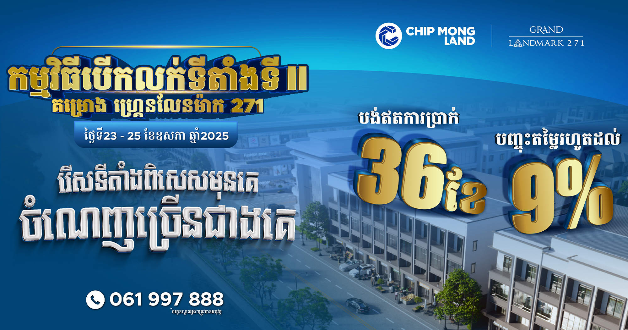 ឱកាសមាស ឱកាសពេជ្រ!! ទិញផ្ទះកណ្តាលក្រុង បានកាន់តែងាយស្រួល បង់អត់ការប្រាក់ ៣ឆ្នាំ ជាមួយក្រុមហ៊ុន ជីប ម៉ុង លែន