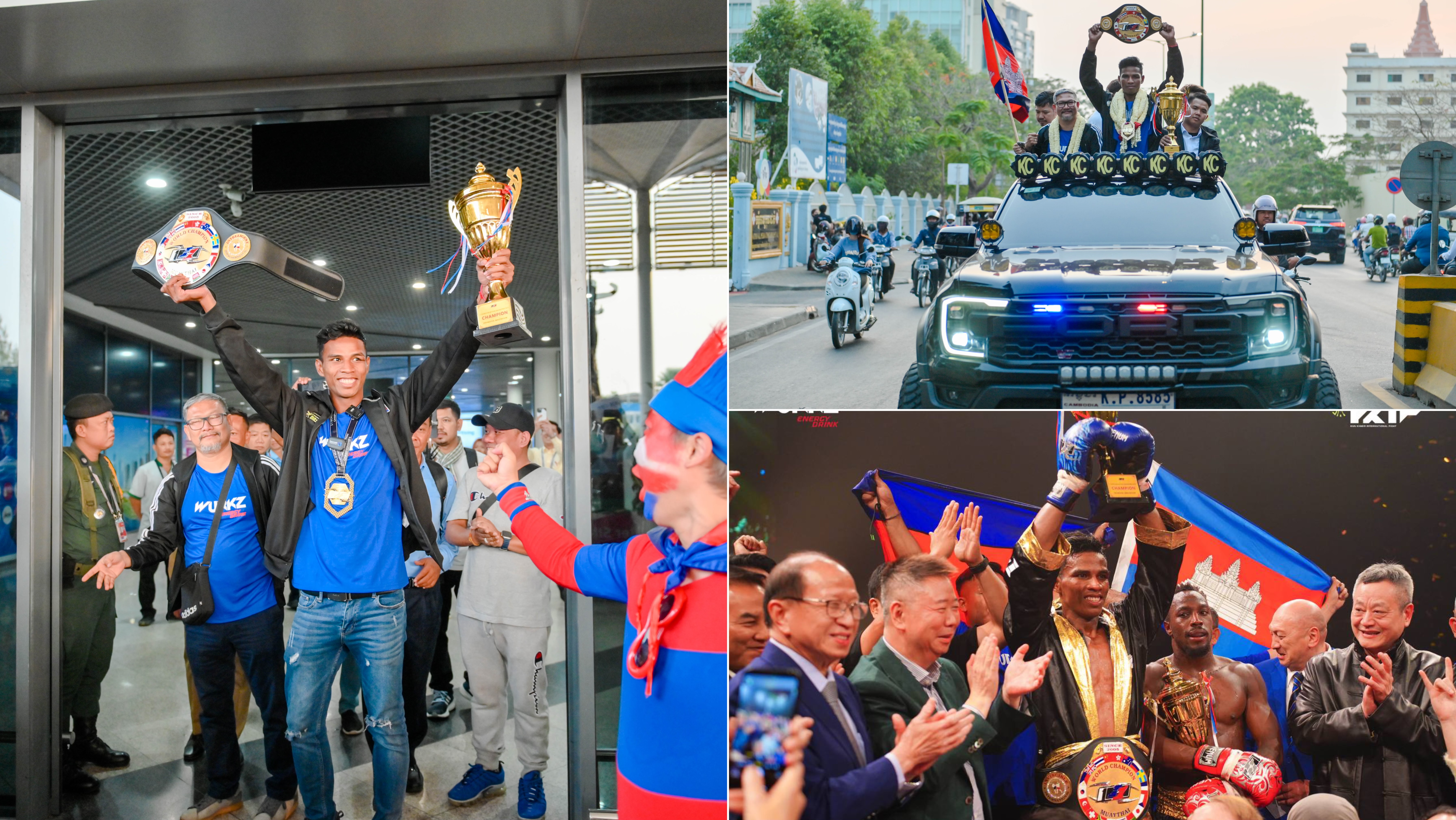 ខ្មែរ ប៊ែវើរីជីស ទទួលស្វាគមន៍យ៉ាងកក់ក្តៅអ្នកលេងជួរមុខគុនខ្មែរ ឈឿង ល្វៃ ដែលបានឈ្នះខ្សែក្រវាត់ពីហុងកុងមកជូនមាតុភូមិ