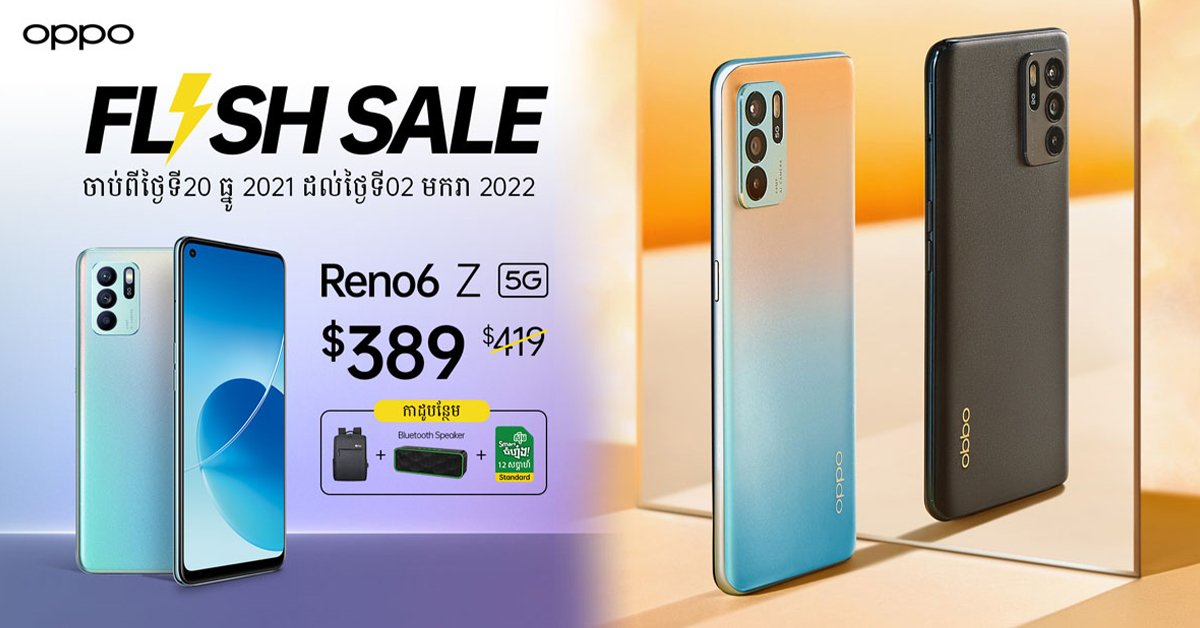 Flash Sale អស់ស្ទះ! OPPO Reno6 Z 5G បញ្ចុះទាំងតម្លៃ $30 បានទាំងកាដូដល់ទៅ $62 រាល់ការទិញចាប់ពីថ្ងៃនេះដល់ថ្ងៃទី02 មករា 2021