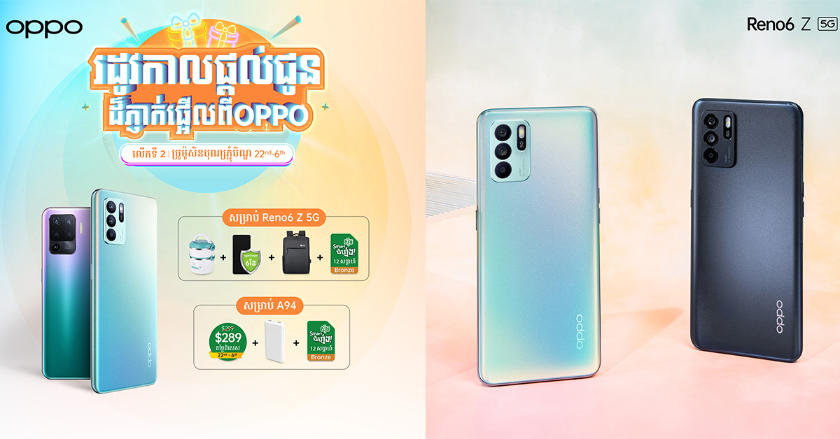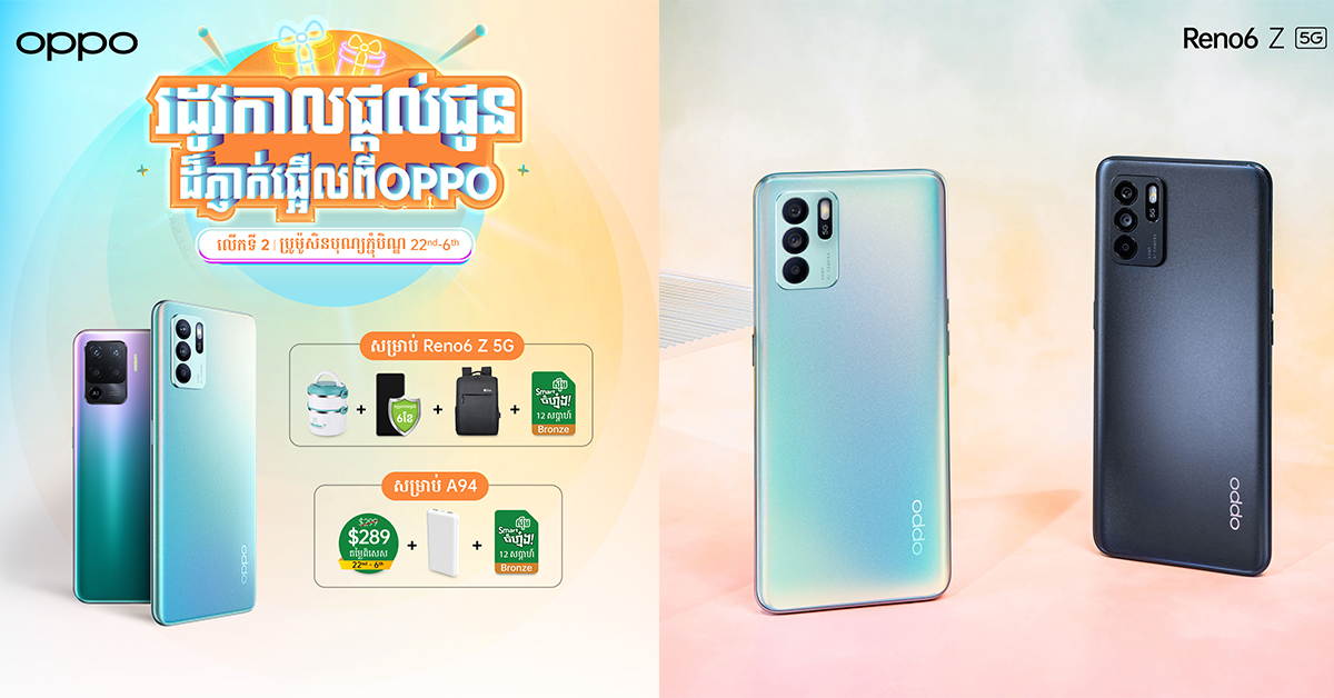 ត្រៀមកាដូភ្ជុំបិណ្ឌឬនៅ? តោះទិញ OPPO Reno6 Z 5G និង OPPO A94 ធ្វើជាកាដូដ៏មានន័យ និងបង្កើតអនុស្សាវរីយ៍ល្អៗជាមួយគ្នា ពិសេសថែមទាំងទទួលកាដូជាច្រើនពី OPPO ទៀត… ចាំអីទៀត?