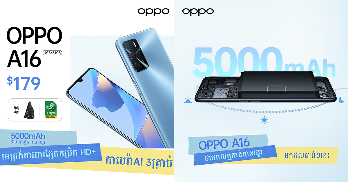 OPPO បញ្ចេញស្មាតហ្វូនលំដាប់ថវិកា OPPO A16 នៅលើទីផ្សារប្រទេសយើងក្នុងតម្លៃត្រឹមតែ $179 ជាមួយលក្ខណៈពិសេសគ្រប់អ្វីដែលលោកអ្នកត្រូវការ