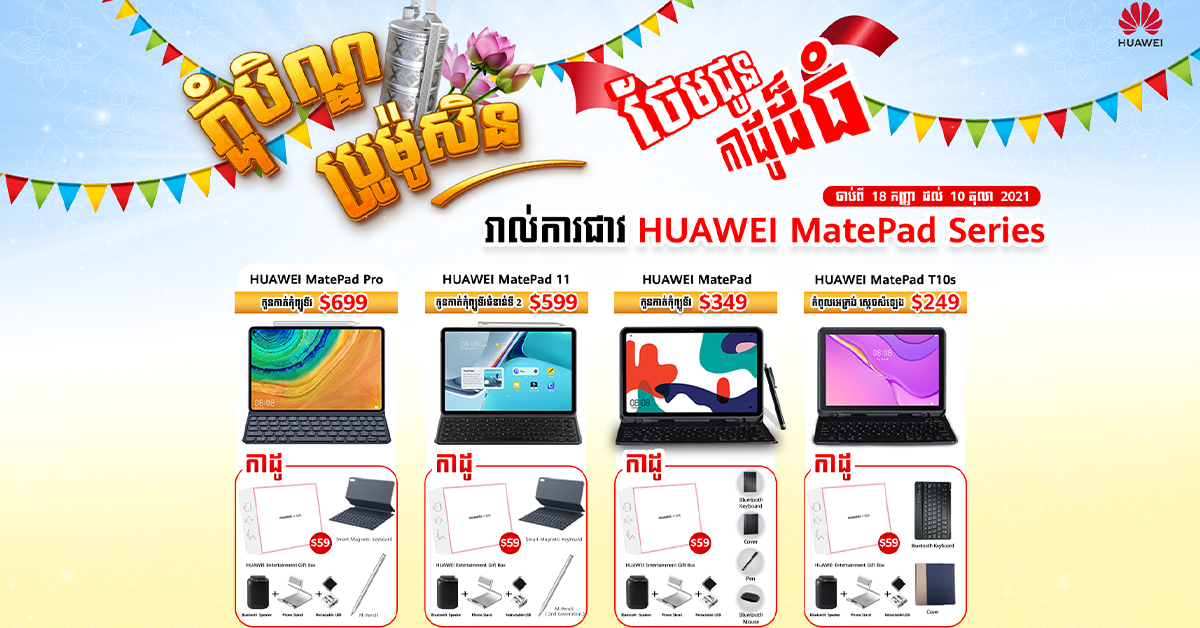 ចំណេញៗ! រាល់ការជាវ Huawei MatePad Series ម៉ូដែលណាមួយ ក្នុងអំឡុងពេលប្រម៉ូសិនភ្ជុំបិណ្ឌខាងមុខនេះ នឹងទទួលបានកាដូបន្ថែម Huawei Gift Box តម្លៃ $59 ភ្លាមៗ