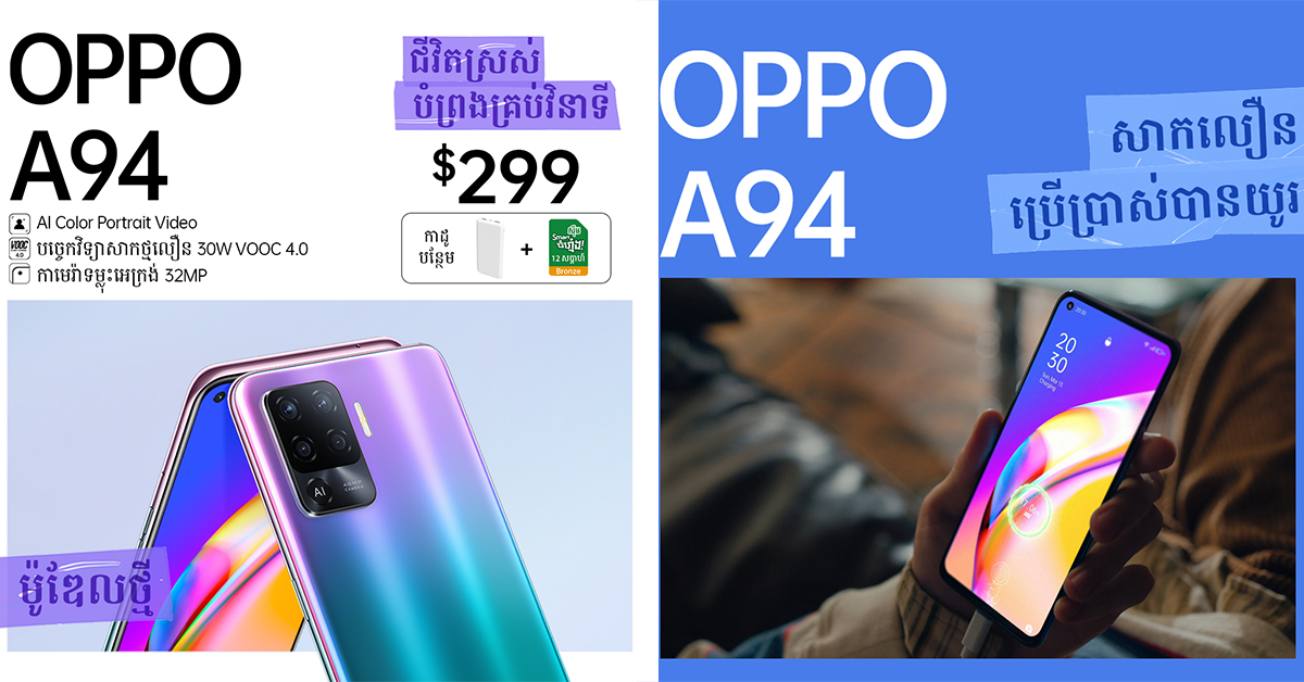 ញាក់សាច់! អំឡុងពេលកូវីដ-19 កំពុងផ្ទុះ ក្រុមហ៊ុន OPPO បានធ្វើកម្មវិធីសម្ពោធតាមអនឡាញយ៉ាងទាក់ទាញ និងប្លែកពីគេនូវទូរស័ព្ទម៉ូដែលថ្មី OPPO A94 ក្នុងតម្លៃត្រឹមតែ $299!
